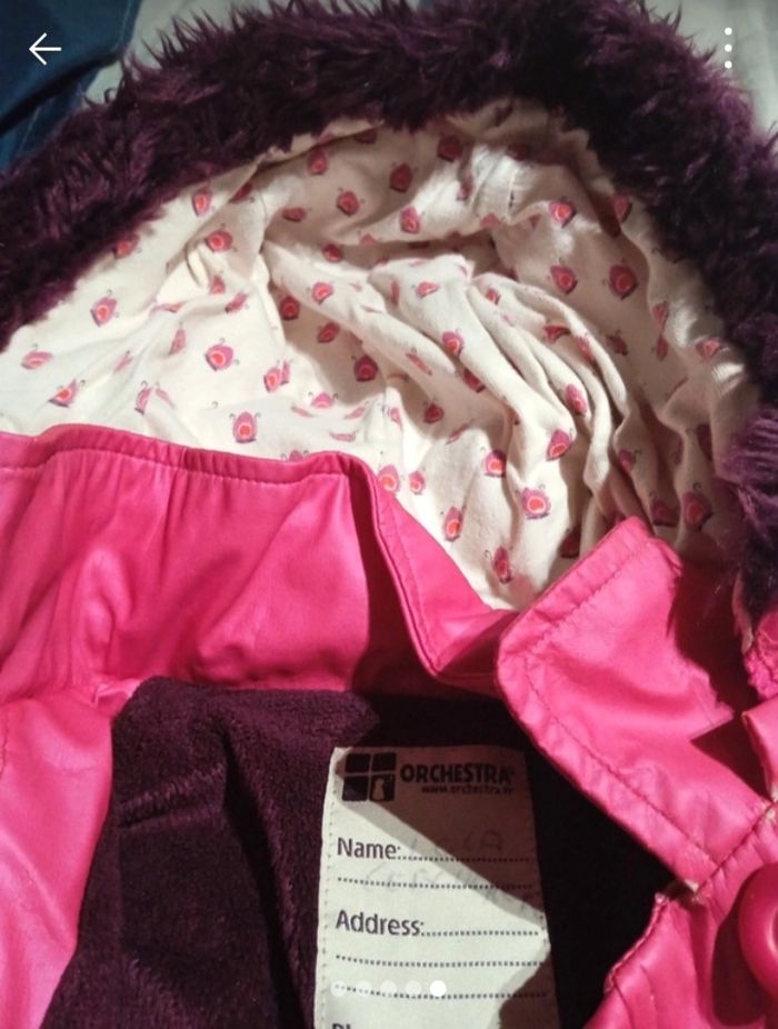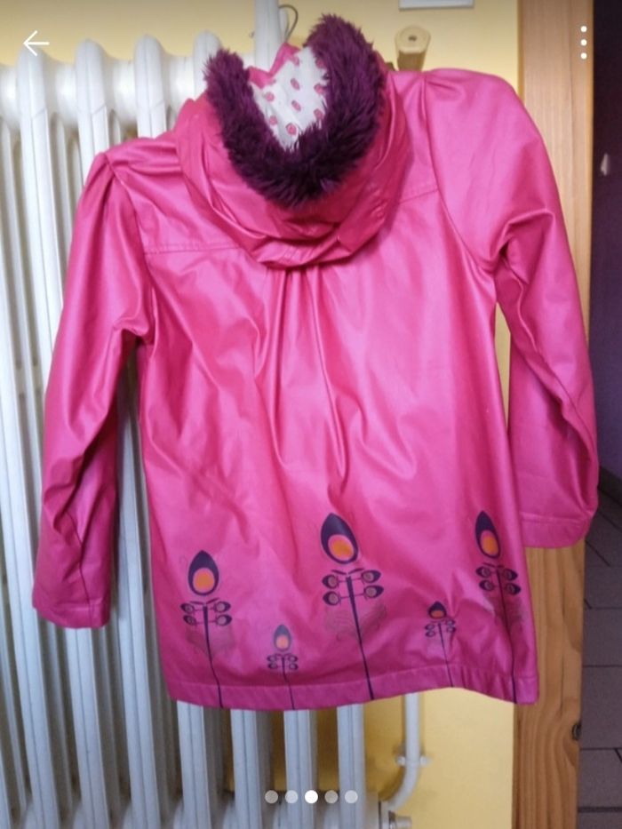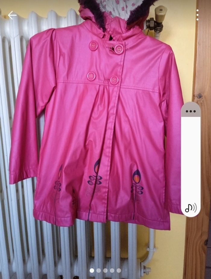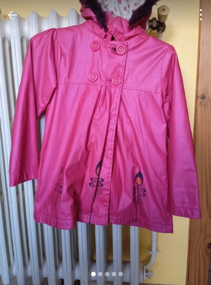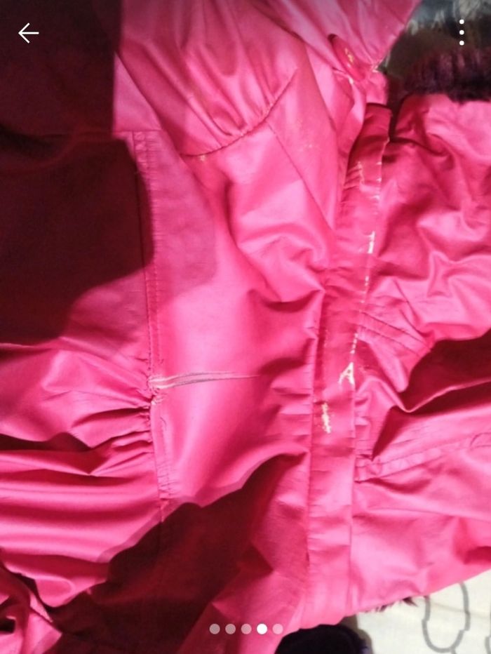 Veste rose pour fille en assez bon état. Il est un petit peu abîmé sous la capuche à cause de la matière, la capuche cache ce petit défaut.