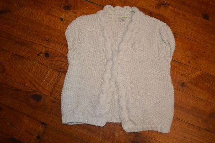 Gilet sans manches Vertbaudet 6 ans Se ferme par une pression Couleur crème avec fils argentés Matière : 69% Acrylique - 26% Laine - 3% Polyester - 2 % Fibre métallique Gilet en bon état, pas de taches, ni trous