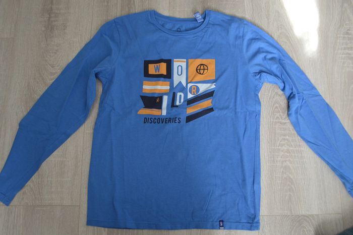Tee shirt manches longues bleu Okaidi 10 ans Tee shirt bleu avec inscription World Tee shirt en bon état, pas de taches, ni trous #10ansgarconninie48
