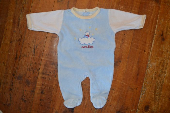 Pyjama velours Sucre d'orge 1 mois Fermeture au dos par pressions Dessin sur le devant Pyjama en bon état, pas de taches, ni trous #1moisgarconninie48