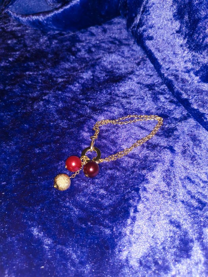 Bracelet breloques doré. 3 perles lumineuses, rouge, bordeaux et dorée. Longueur 15 cm. Vous trouverez le collier assorti dans mon dressing. ➡️Envoi rapide ➡️Réduction dès 5 articles. N'hésitez pas à fouiller mon dressing car toutes les tailles et styles sont mélangés. Nombreux petits prix. À bientôt 😊