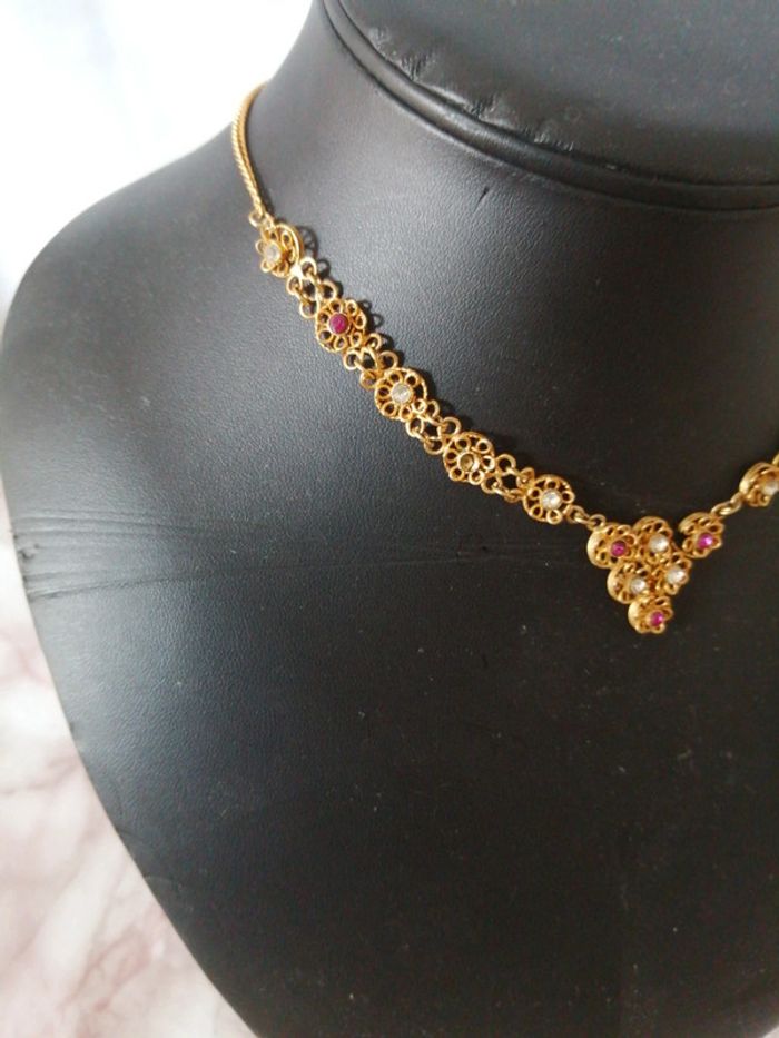 Joli collier fantaisie de couleur doré, orné de strass roses et blancs.