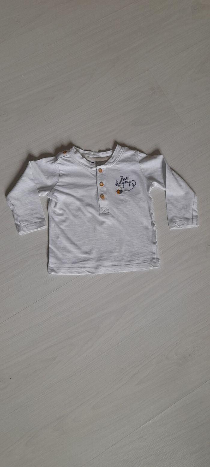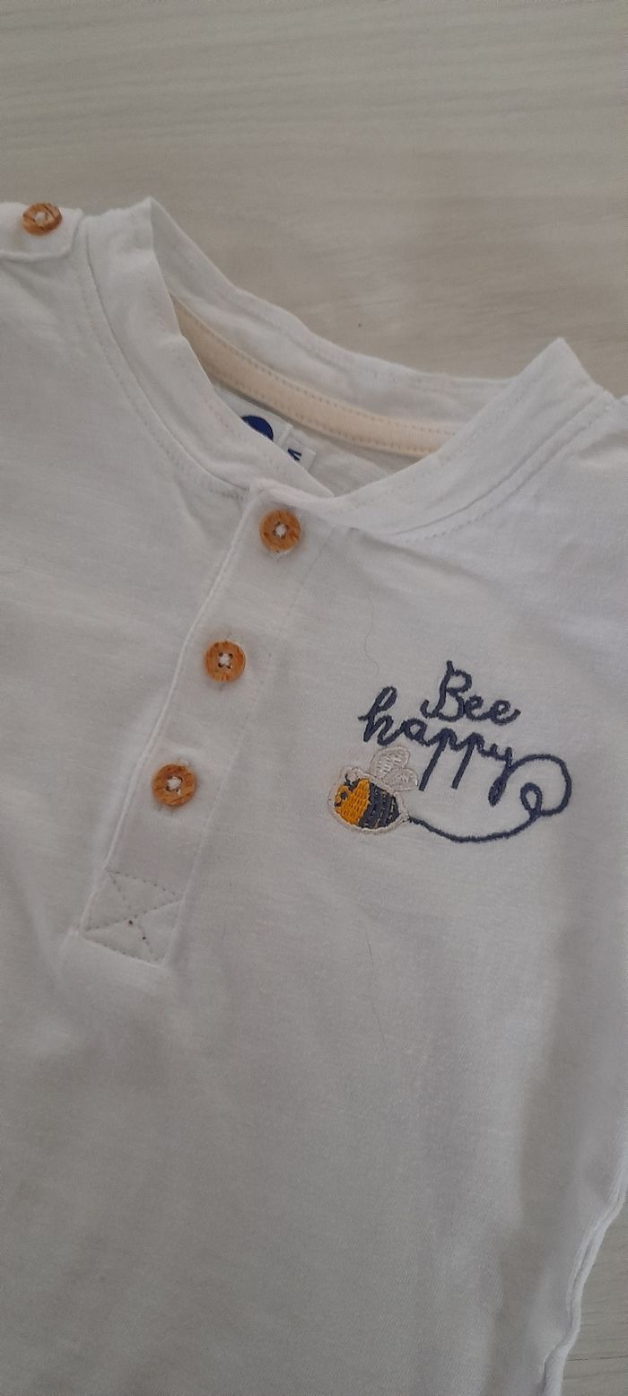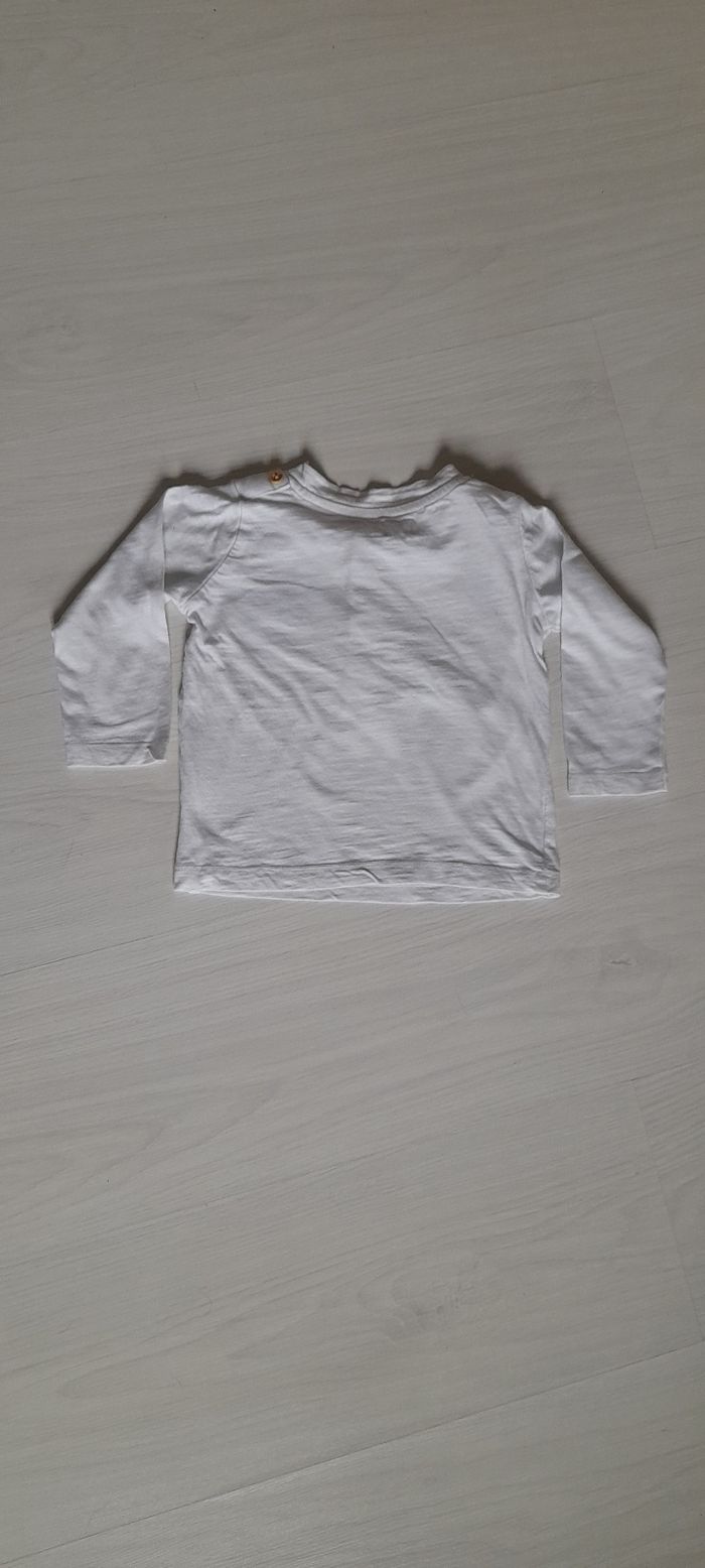 Tee-shirt manches longues T 18 mois Marque MOTS D'ENFANT Couleur blanc cassé Attache boutons cou devant Motif sur poitrine gauche Très très bon état