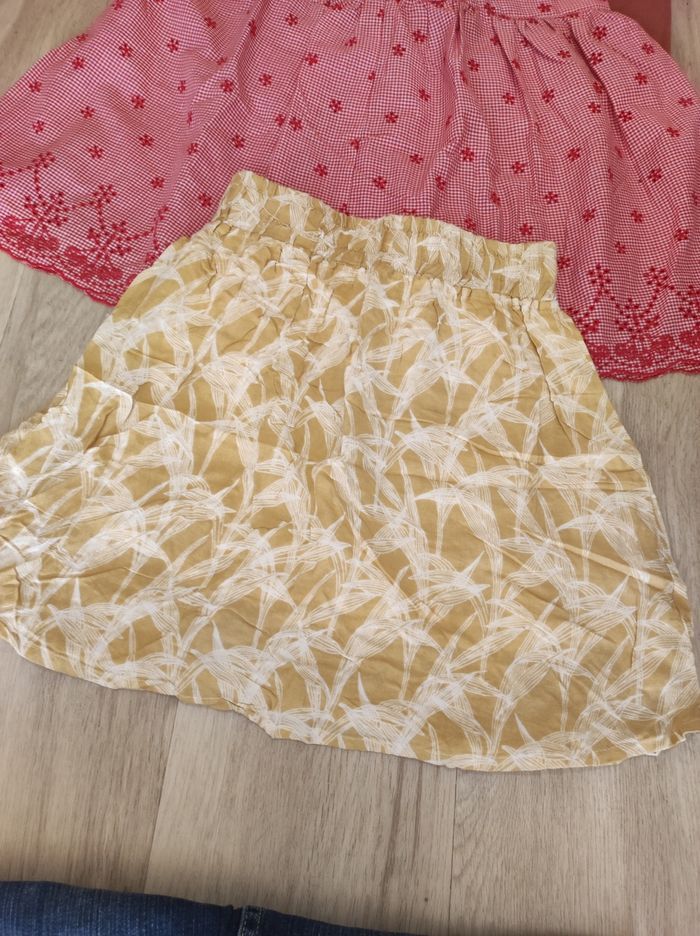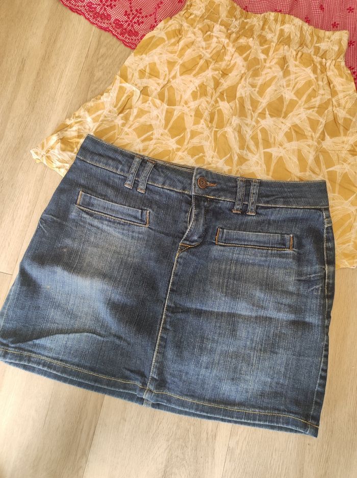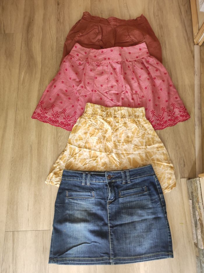 Jupe en jean Naf Naf Jupe jaune fluide gambette box neuve Jupe rouge style broderie anglaise Naf Naf neuve Jupe en toile rouille Jennifer Le tout en bon état général n'hésitez pas à regarder mon dressing j'ai d'autres articles les réductions sont activées