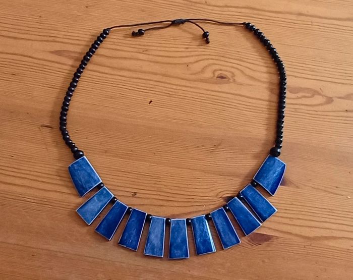 Collier avec un cordon noir, des perles en plastique noir et des perles rectangulaires bleu violacé. Longueur = 48 à 70 cm.