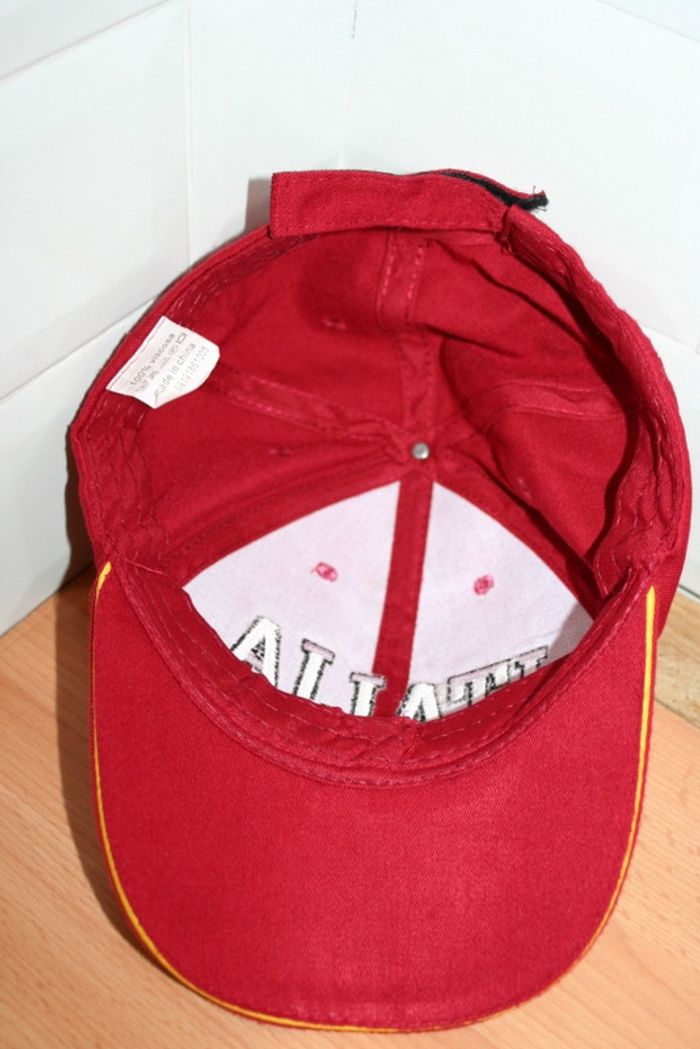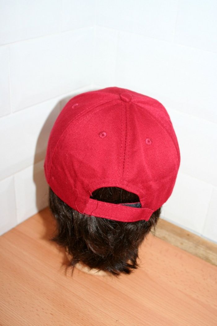 Casquette rouge foncé liseret jaune sur la visière, 100% viscose, fermeture à scratch à l'arrière, très peu portée, 80g