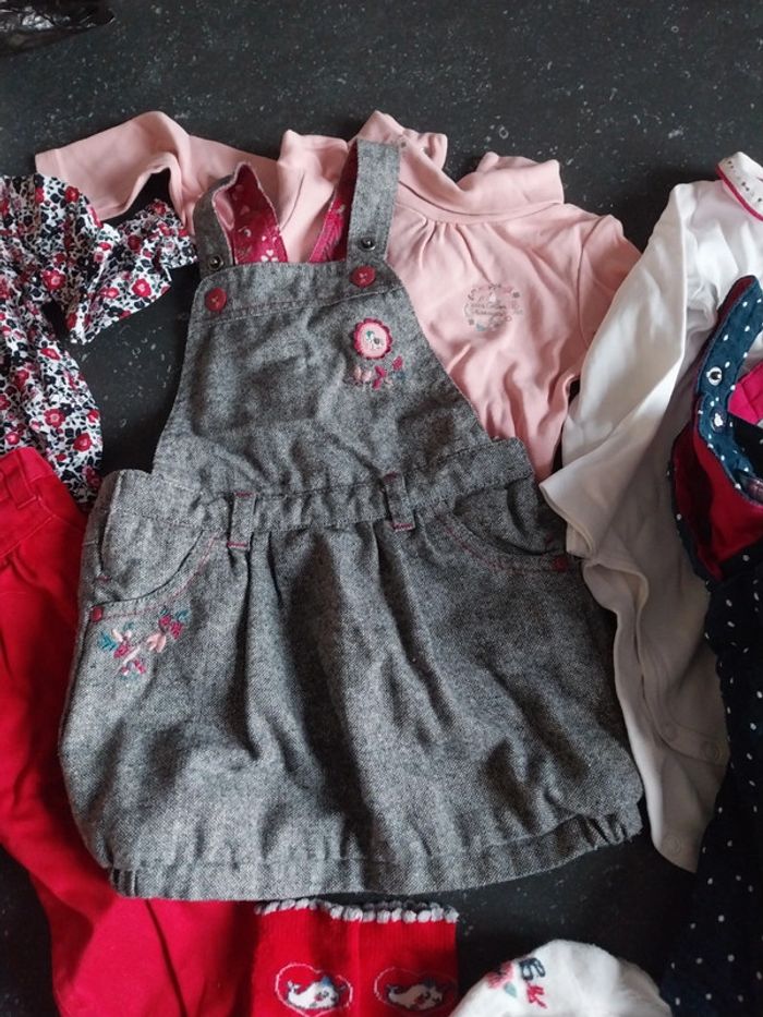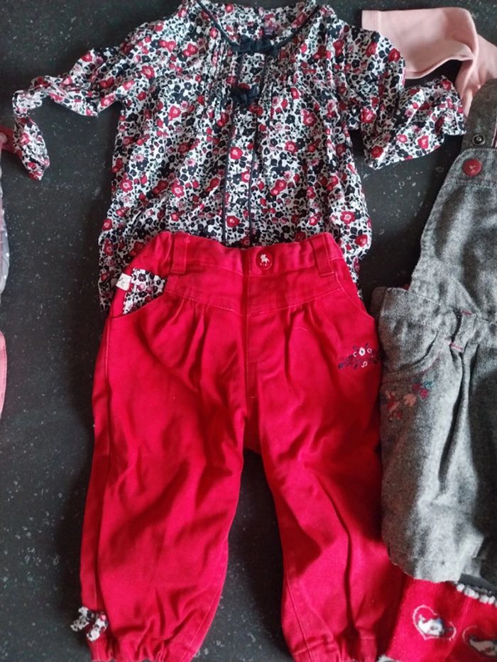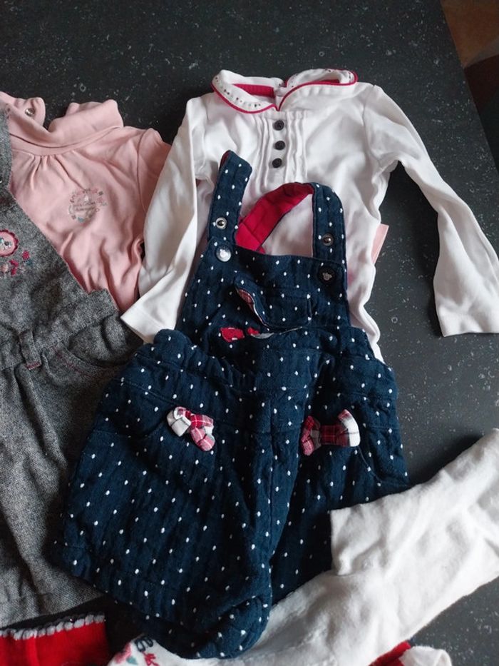 #12moisfillevanessa357 #9moisfillevanessa357 1 pantalon et une blouse 1 robe et 1 bodie assorti 1 combishort et 1 bodi assorti 1 paire de chaussettes et 2 collants Tout vient de chez Sergent major