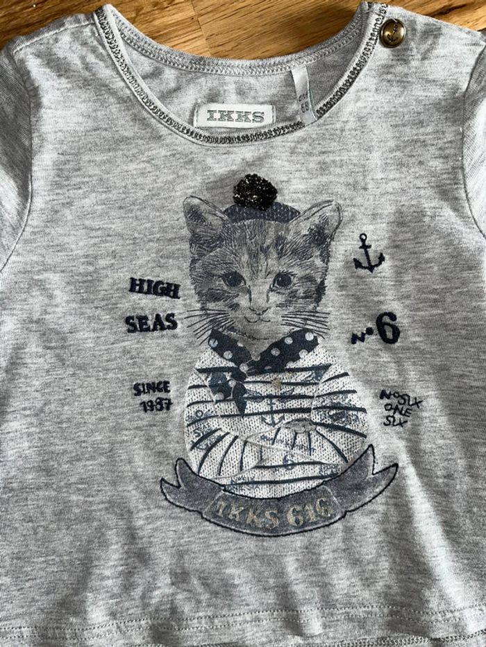 T-shirt gris motifs chat Marin Ikks Tres Bon etat 6 mois/68 cm N’hésitez ça pas à faire un tour dans mon dressing je fais des prix sur les lots ☺️