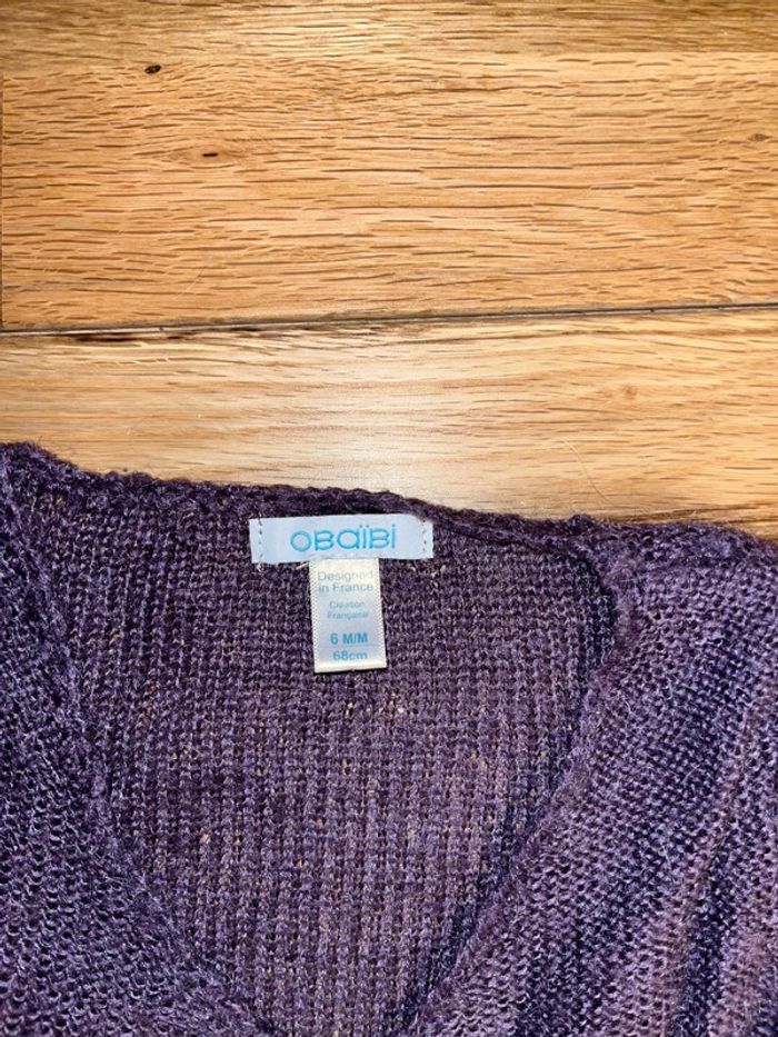Gilet croisé cache cœur en laine obaibi mauve très bon état 6 mois - photo numéro 2