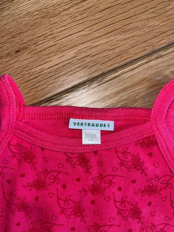 Body barboteuse rose fuschia à motifs de roses Vertbaudet Tres Bon etat 3mois/60 cm N’hésitez pas à faire un petit tour dans mon dressing je fais des prix sur les lots ☺️