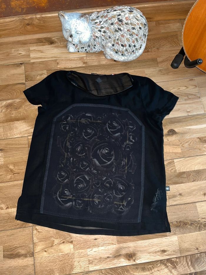 Jolie blouse noire motifs de roses devant Le temps des cerises Neuf sans étiquette Xs N’hésitez pas à faire un tour dans mon dressing je fais des prix sur les lots ☺️
