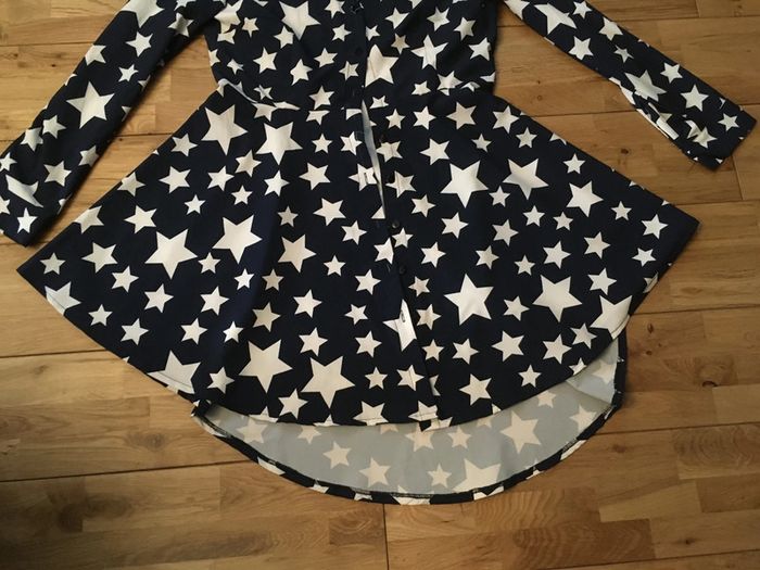 Jolie blouse tunique col mao Bleu étoiles blanches plus long derrière Pas de taille ni de marque acheté dans un magasin vintage