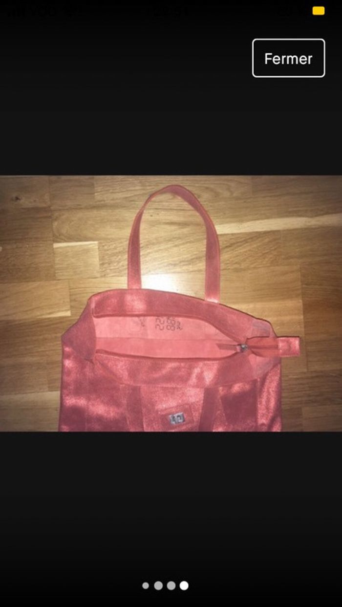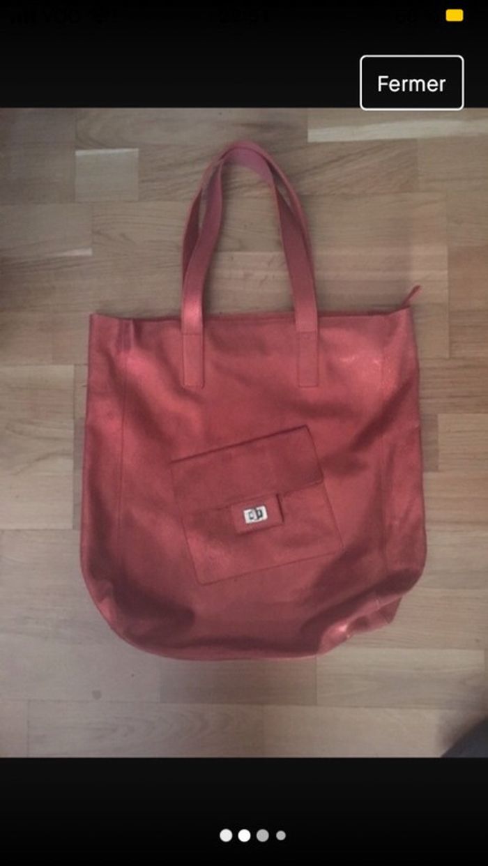 sac ocre brillant en croûte de cuir pas doublé une poche à l’intérieur peut contenir une farde A4 nickel