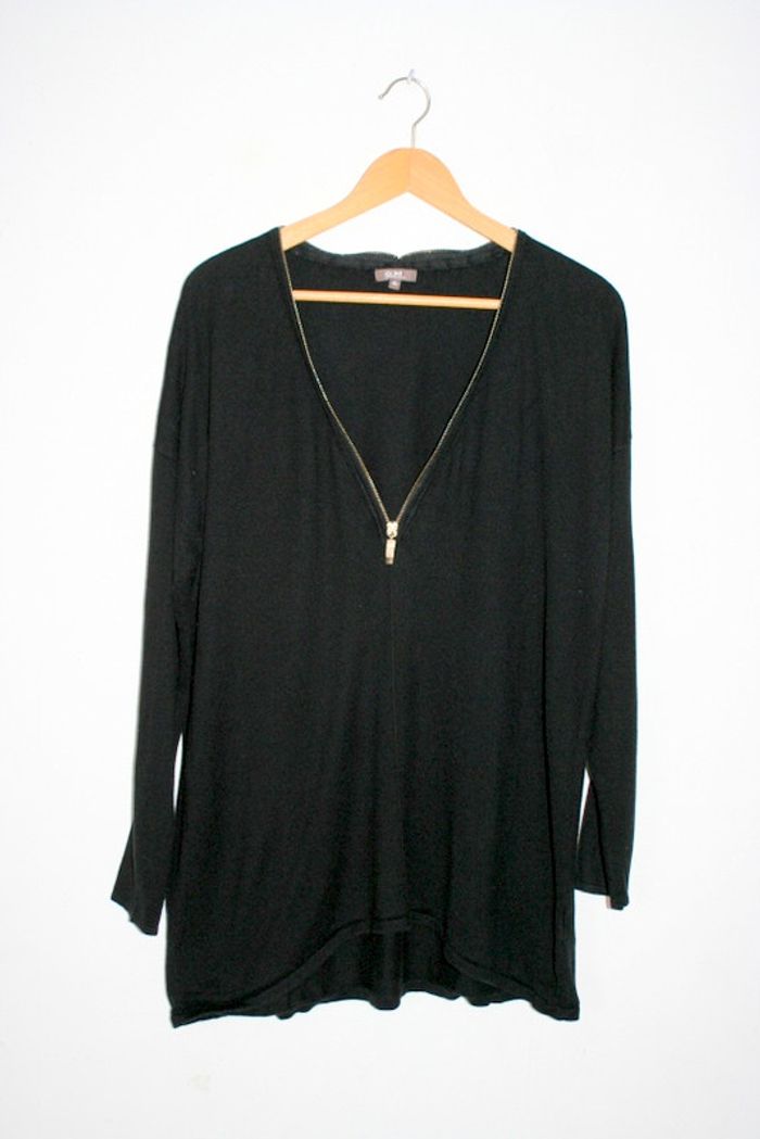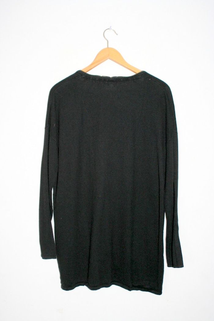 Haut lainage de chez Grain de Malice taille XL, un peu bouloché, quelques fils tirés, 56cm d'épaule à épaule, 63cm d'aisselle à aisselle, 70cm de long, 52% coton / 41% viscose / 7% polyamide, 350g