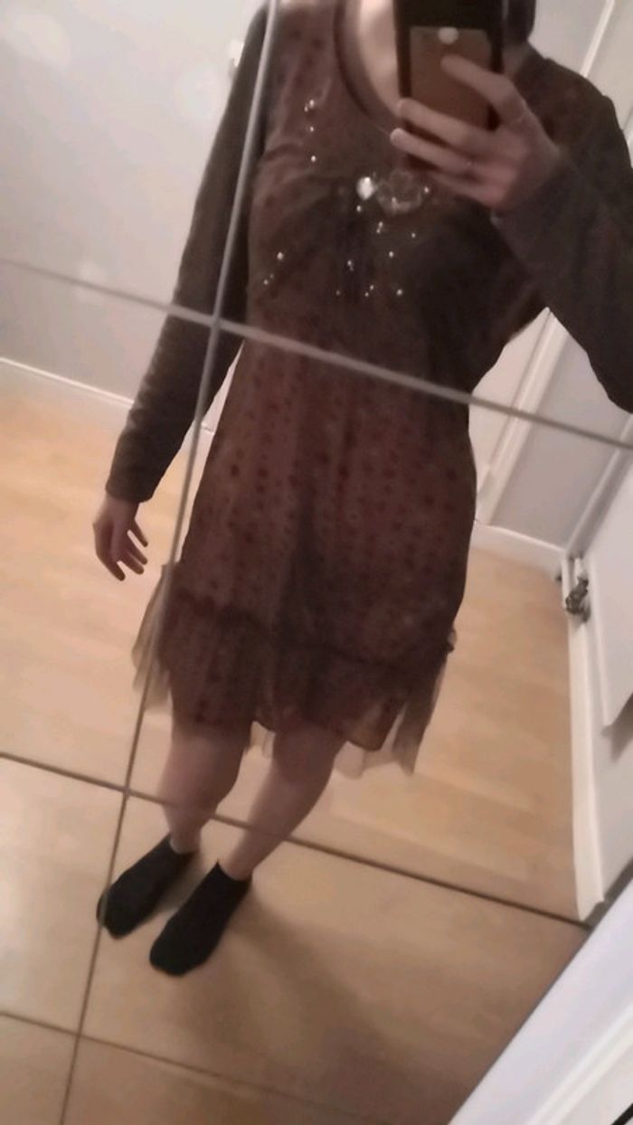 🛍⚠️🛍 Achat uniquement par mondial relais sinon rajouter 5 euros supplémentaires pour relais colis et chrono post. Je ne fais pas d'envoi UPS ou autre. Me contacter avant achat chrono post et relais colis. Robe marron avec motif perle manche. #lucyrobe22. #lucyvetement22