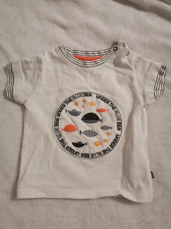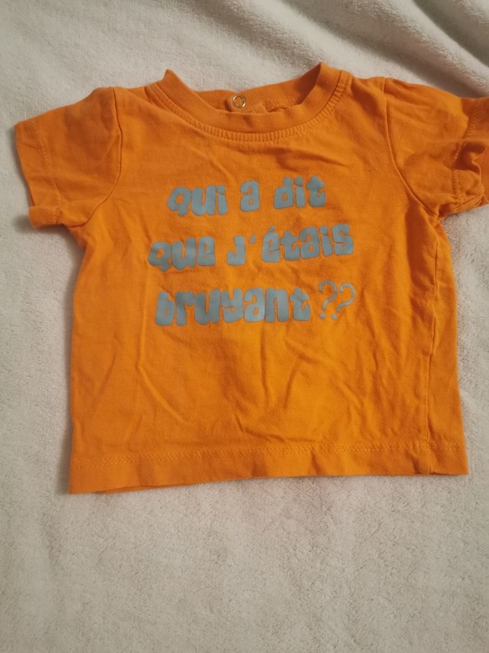 Tee-shirt blanc : obaibi taille 3 mois Tee-shirt jaune : tape a l'œil taille 3 mois Tee-shirt orange : kimbaloo taille 3 mois Polo bleu et blanc : orchestra taille 3 mois