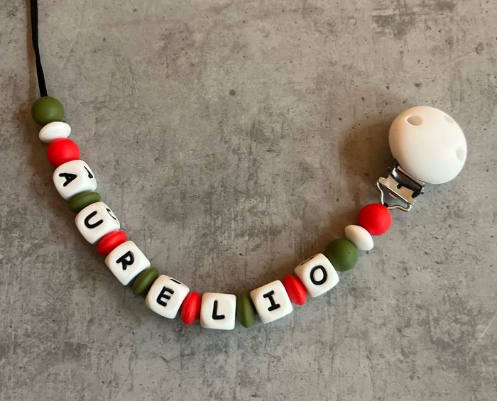 Attache tétine personnalisé en silicone ou en bois au souhait de l’acheteur . Personnalisable au choix de l’acheteur que ce soit la couleur comme le prénom ou le thème . Le fil est doublé pour plus de sécurité tout le long de l’attache tétine. N’hésitez pas à me demander et regarder mon dressing.