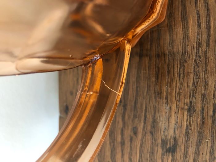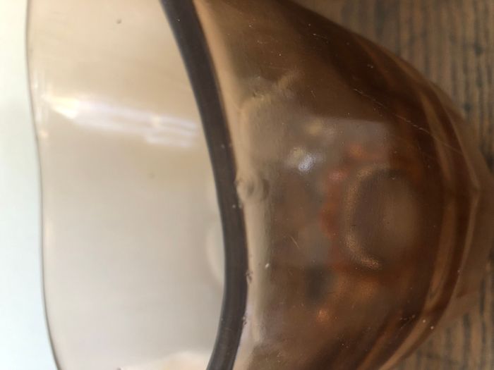 Vintage joli pichet peut-être le modèle Rosaline de chez Arcoroc ou Luminarc mais je ne suis pas sure En verre très épais avec quelques bulles ATTENTION : vendu en l'état avec défauts : 2 fêlures au niveau des anses non circonférencielles : l'anse reste donc bien stable, et un petit accroc en haut = voir photos Peut toujours être utilisé comme pichet ou servir pour mettre des fleurs par exemple Le pied est joliment travaillé 15 cm de hauteur et 12,5 cm de diamètre Made in France