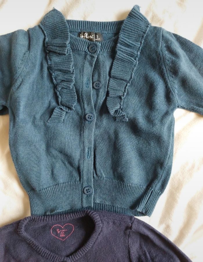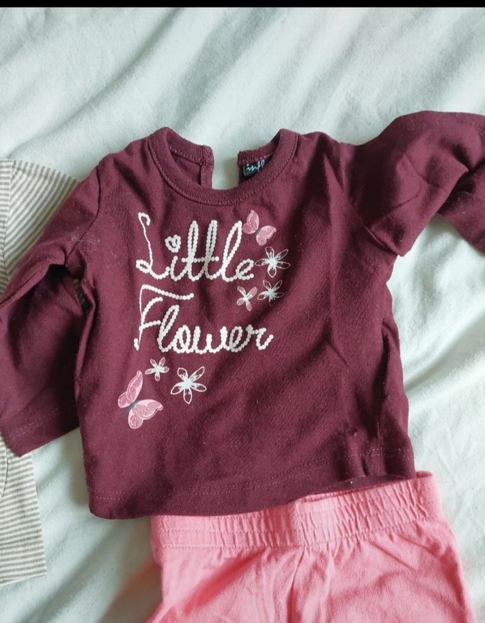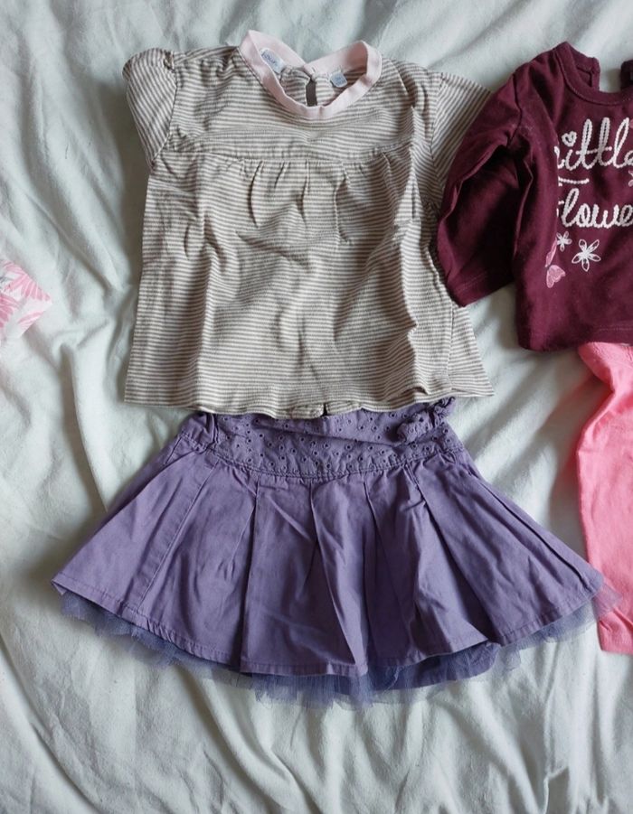 Lot de 9 articles composé : Une jupe violette 1 haut manche longue rayé rose et marron 1 haut violet manche longue "littéraire flower" 1 legging rose 1 robe fleurie rose /blanche/grise 1 robe fleurie blanche avec fleurs orange et bleues 2 gilets un marine grain de blé et un bleu encre 1 t shirt orchestra orange Différentes marques Très bon état