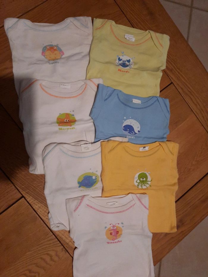 7 Bodies filles 6 mois du lundi au dimanche Manches longues Dans l'ensemble bon état, quelques légers petits défauts suivant photos, couleur de certaines pressions et une manche un peu jaunie... rien de très visible. Réduction par lots activées %%%