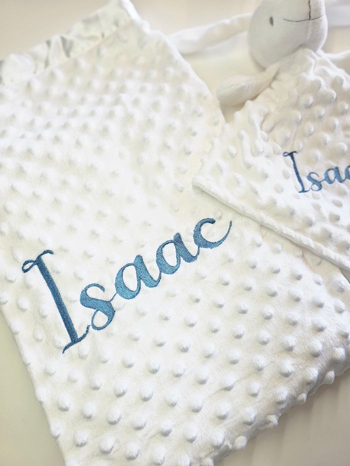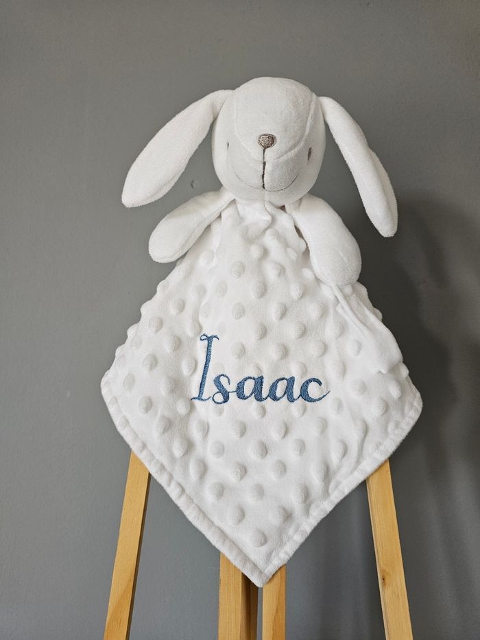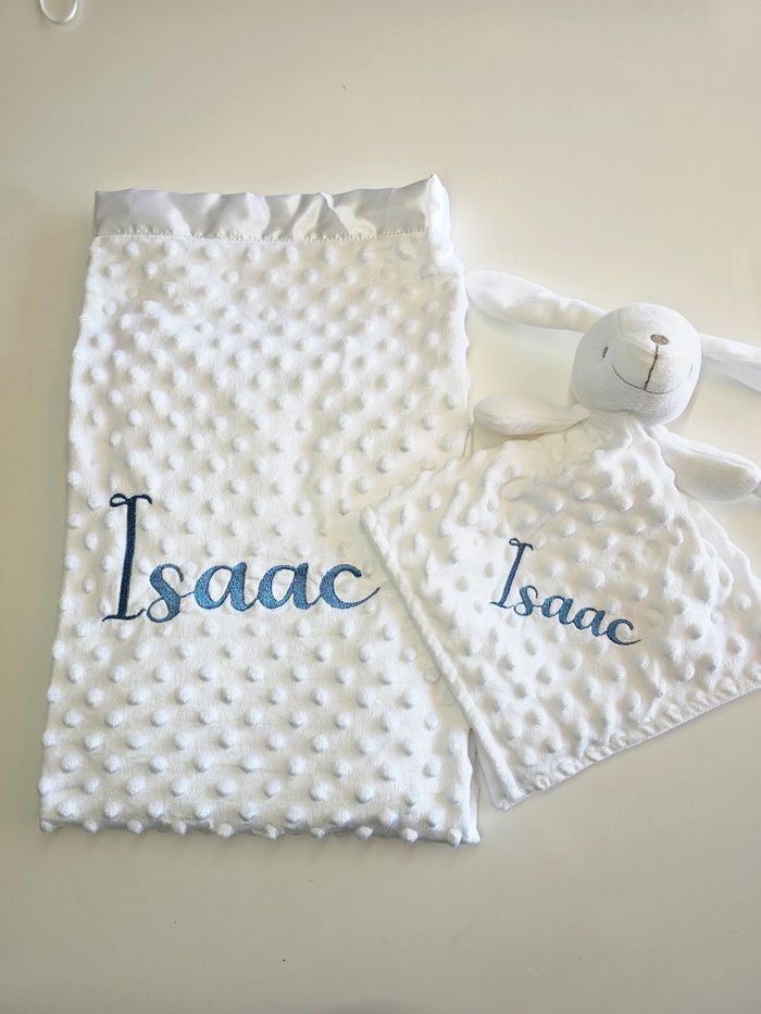 Couverture blanche accompagnée de son doudou lapin Prénom brodé Écriture et couleur à choisir N'hésitez pas à me laisser un message pour plus de renseignement