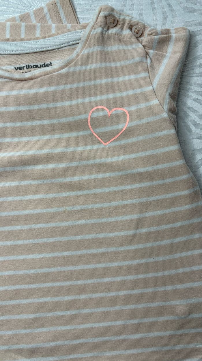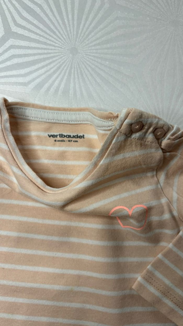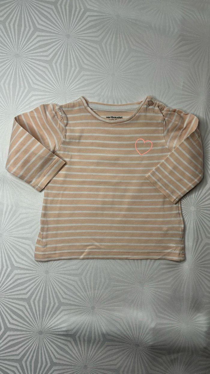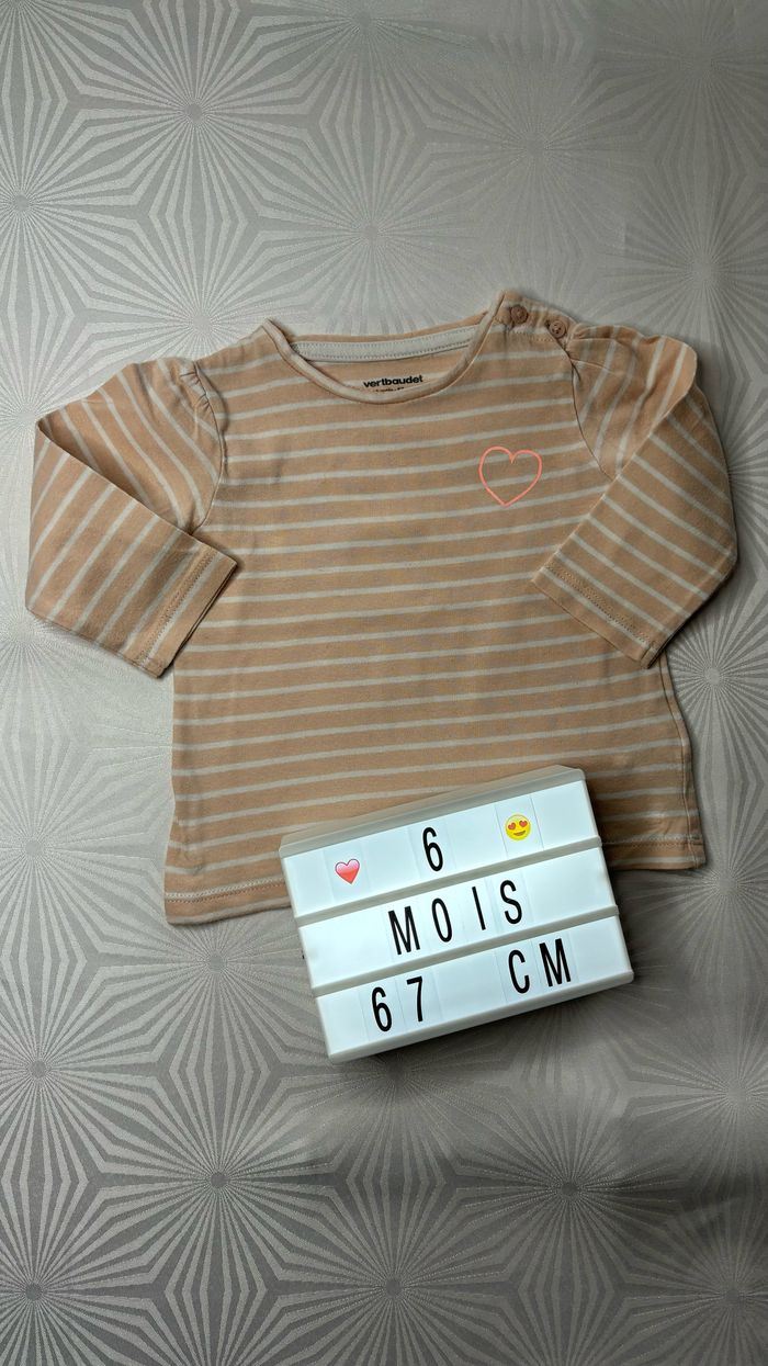 💛 Tee-shirt à manches longues 💛 🧡 Taille: 6 mois - 67 cm 🧡 Marque: Verbaudet 🧡 Couleurs: Orange pâle, abricot rayé blanc avec un motif cœur ‼️ Une petite tache à l’avant près du cœur, visible sur la photo numéro 5