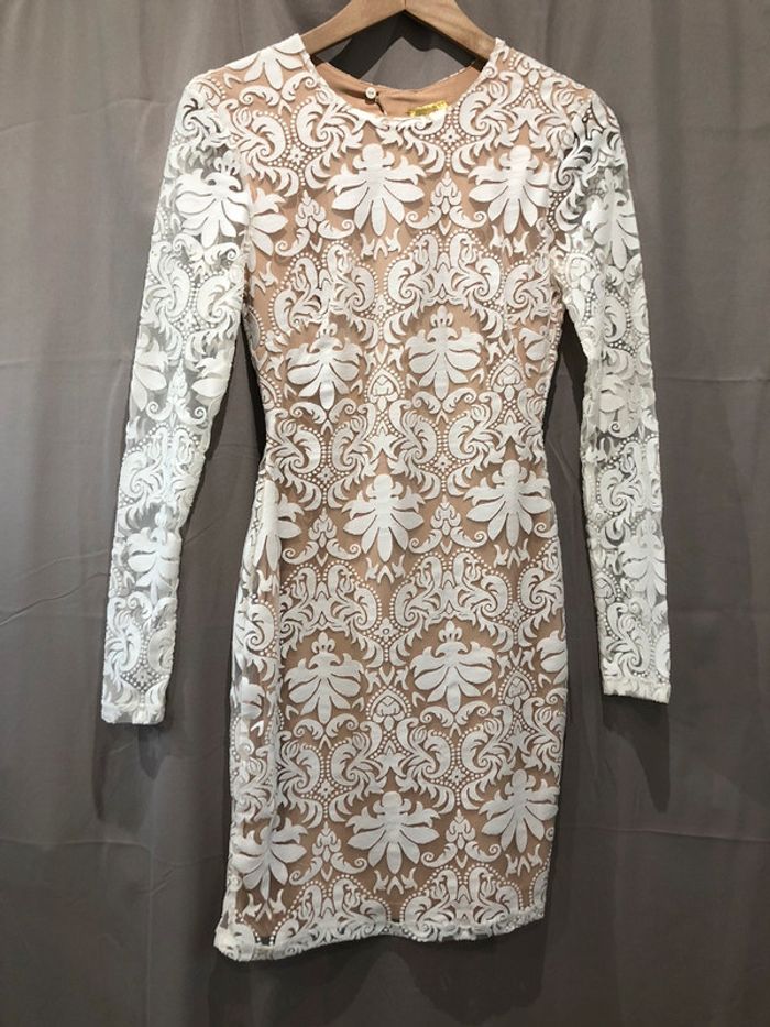 robe fourreau dos nu, en dentelle blanche. transparence pour le décolleté et les bras. portée une fois, entretien pressing