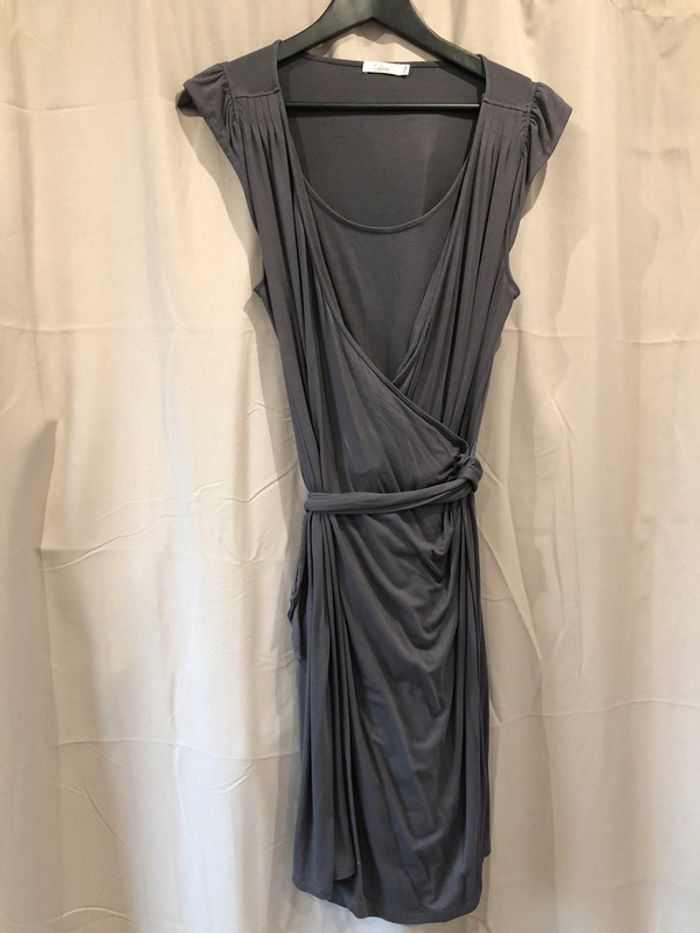 Robe de Grossesse et Allaitement grise. Le tissus est très doux, la forme cache coeur est pratique pour allaiter. Taille ajustable, portée quelque fois, joli tombé très féminin. sans marque