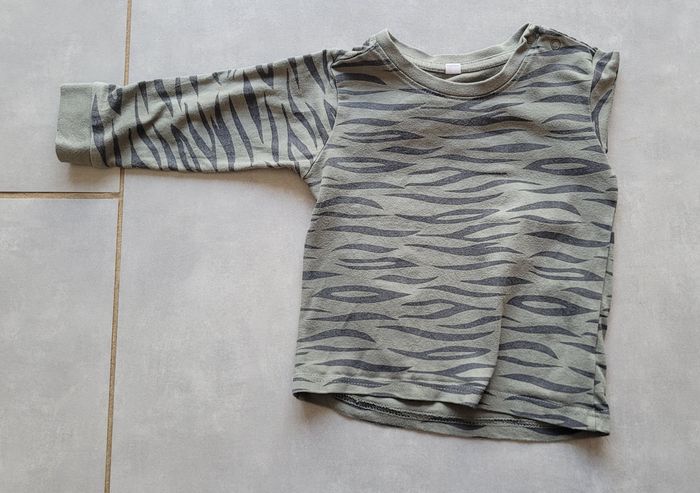T-shirt manches longues, dans les tons kaki, zébré, de la marque Zeeman, taille 18 mois (86 cm), en très bon état. Article lavé pour la vente.