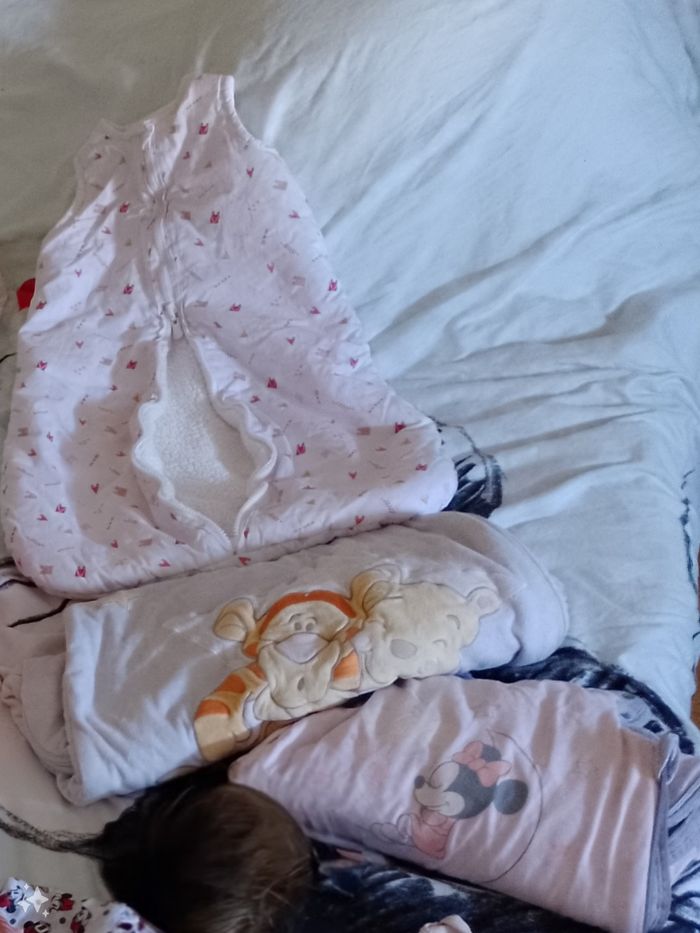Lot gigoteuse : - 1 Réversible été/hiver 0-6 mois. - 2 Tigrou évolutif 0-36 mois avec pression à l'arrière en bon état. - 3 Minnie offerte car défaut de fermeture difficile.