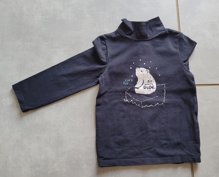 Sous pull, de couleur marine avec motif, de la marque Kiabi, taille 18 mois (77-82 cm), en très bon état. Article lavé pour la vente.