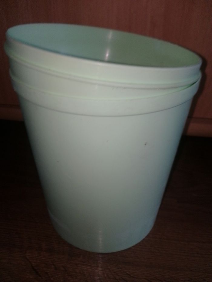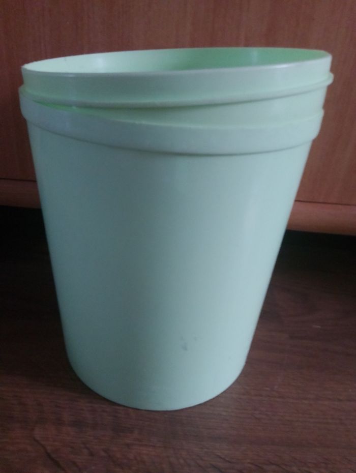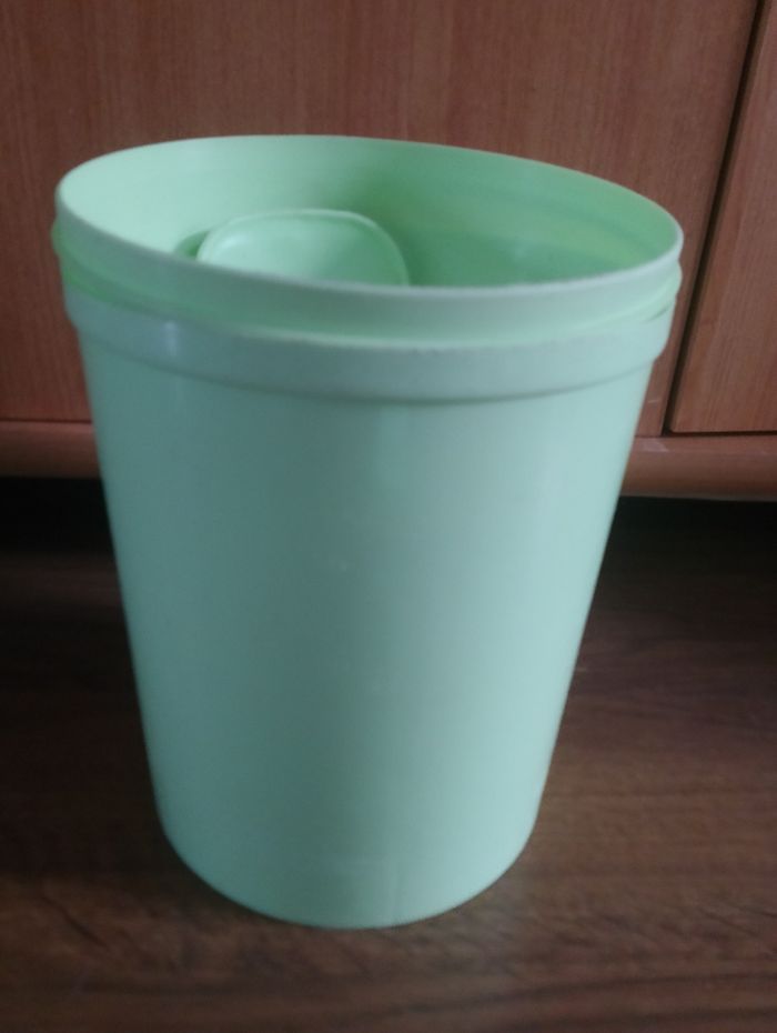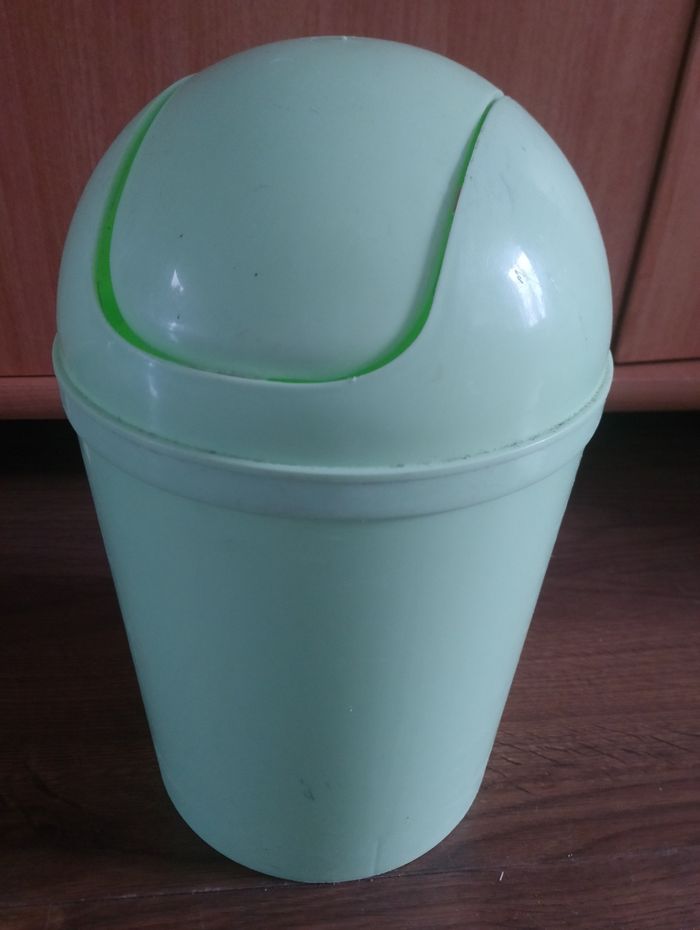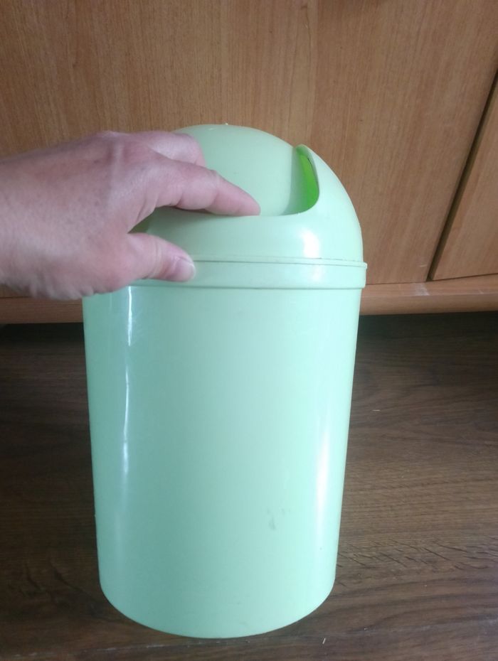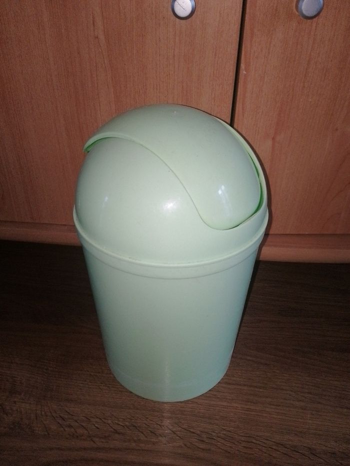 Petite poubelle verte Couvercle a bascule Hauteur avec couvercle environ 31cm Diamètre 19,5cm Couleur réel photo 4 et 5 Sera nettoyé pour la vente