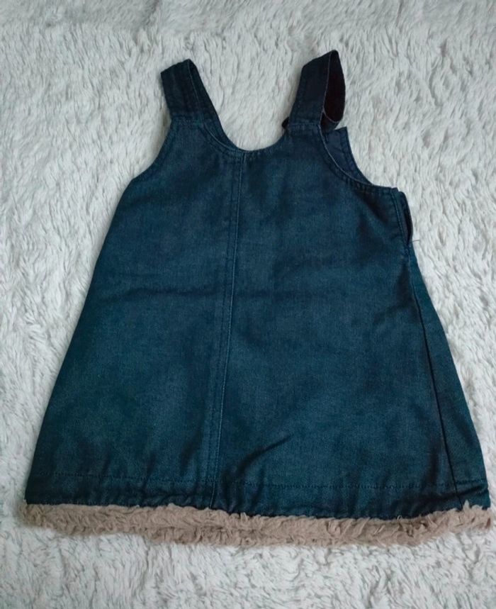 Robe en jean bleue. S'attache avec des boutons sur le haut avec une poche sur le devant et un motif fleur. Marque : natalys Taille : 18 mois. Matière : 58 % de coton & 42 % polyester. Doublure :55 % polyester & 45 % de coton
