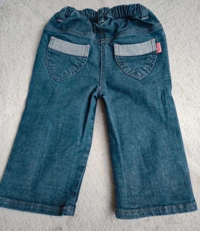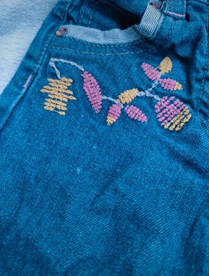 Jean bleu avec motif fleurs sur une poche. 2 poches à l'avant et à l'arrière. Se ferme avec un bouton pression et une fermeture éclair. Élastique au niveau de la taille avec passants pour ceinture. Petit défaut sur une cuisse (voir photo). Taille : 6 mois // statue 67 cm Marque : kitchoun Matière : 98 % coton et 2 % élasthanne.