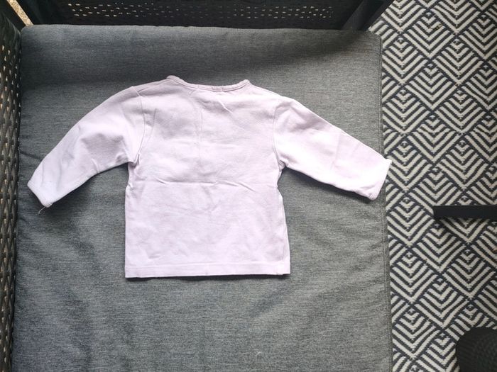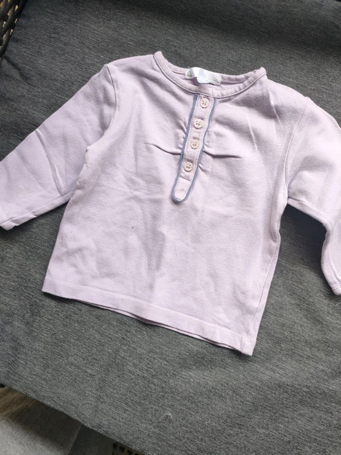 Haut lilas avec bouton sur le devant. 1 bouton de secours. Taille : 6 mois // stature : 67 cm Marque : kitchoun Matière : 95 % coton et 5 % élasthanne