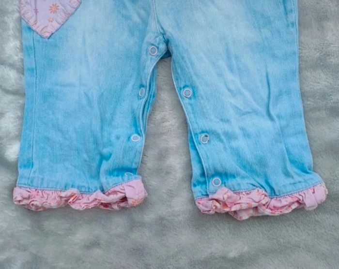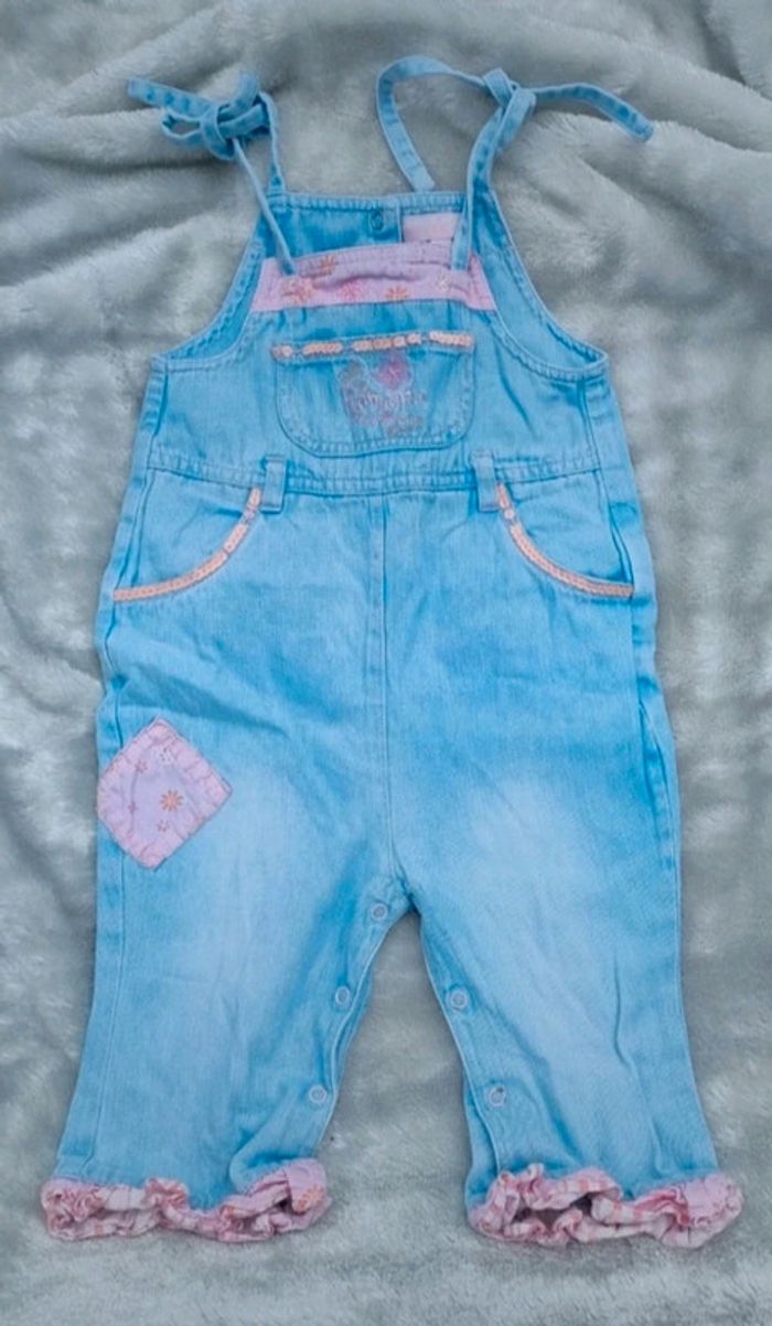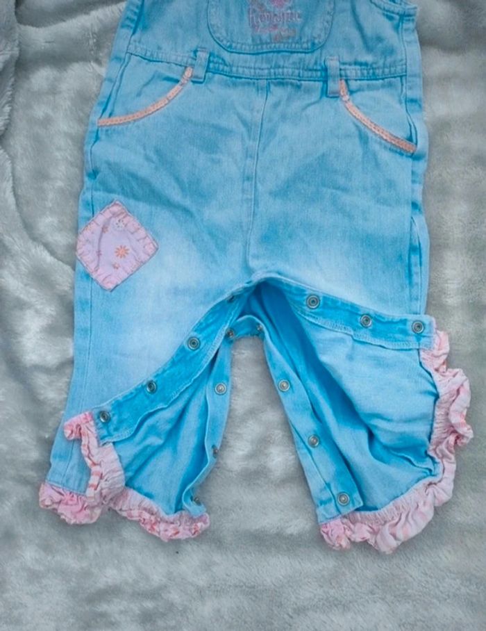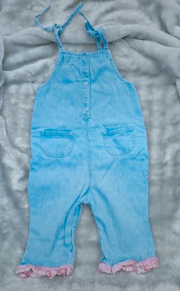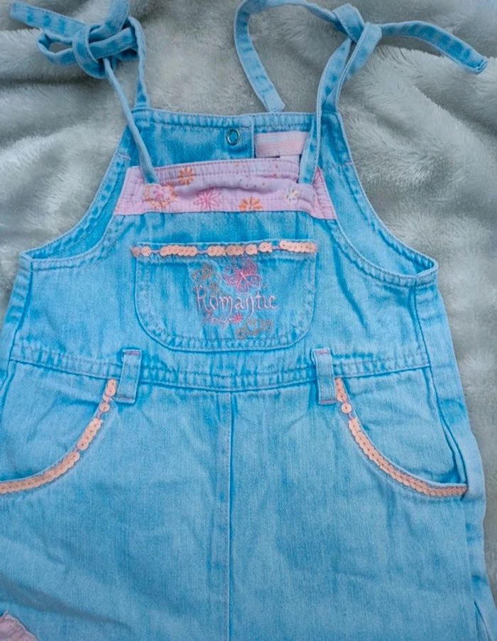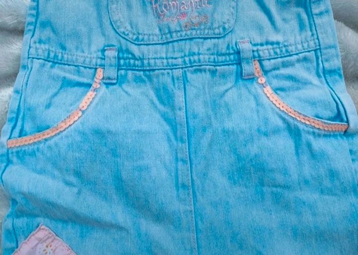 Salopette bleue et rose 1 poche au niveau de la poitrine. 2 poches sur les côtés et à l'arrière. Écriture : romantic baby S'attache avec des boutons pressions à l'arrière et à l'entre jambe Nœuds à faire sur les épaules. Effet volant sur les chevilles. Manque quelques éléments décoratif sur les poches (voir photos). Délavé sur les jambes Marque : kimbaloo Taille : 18 mois. Matière : 100% coton