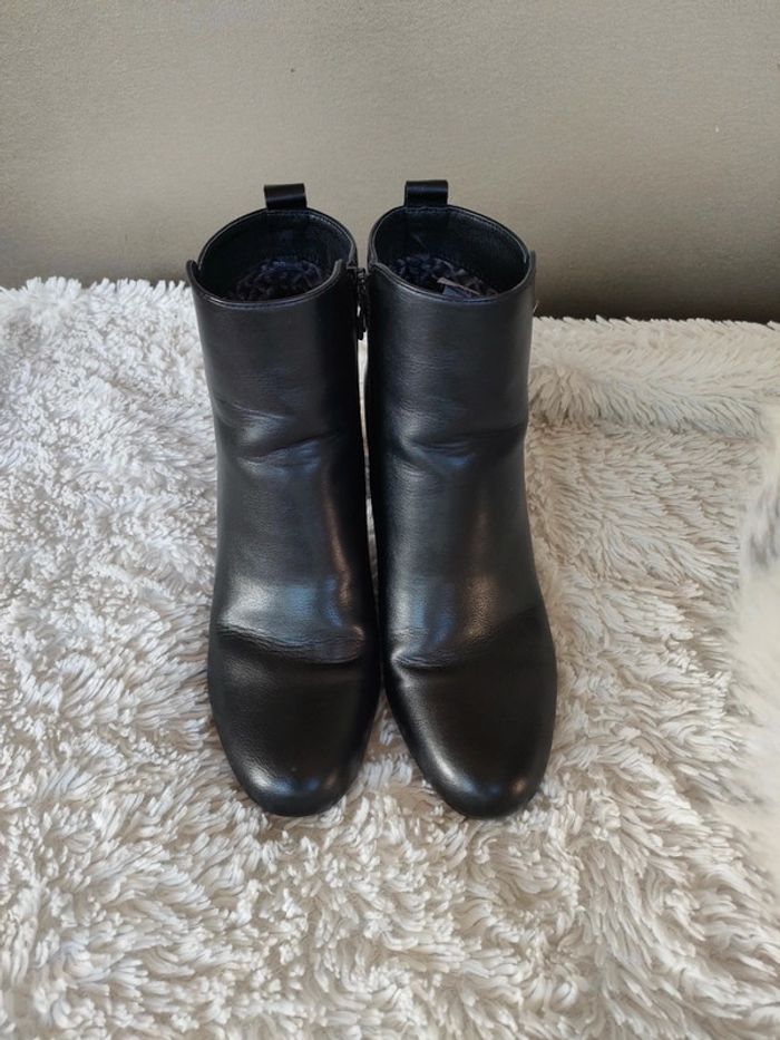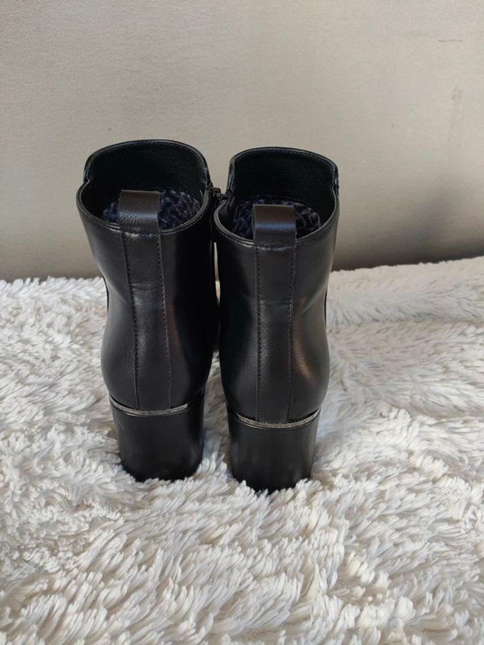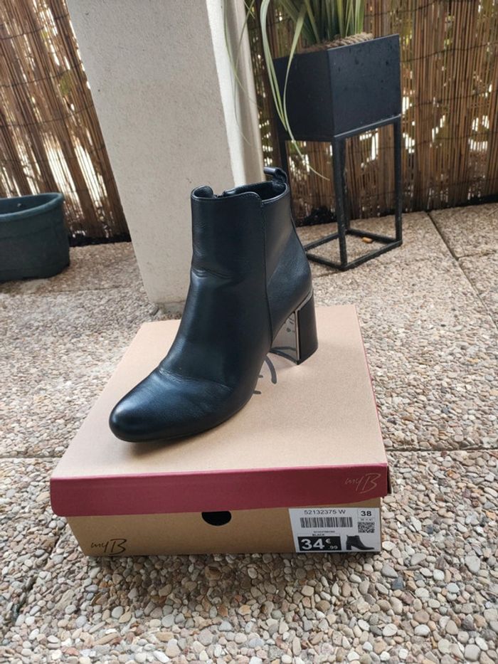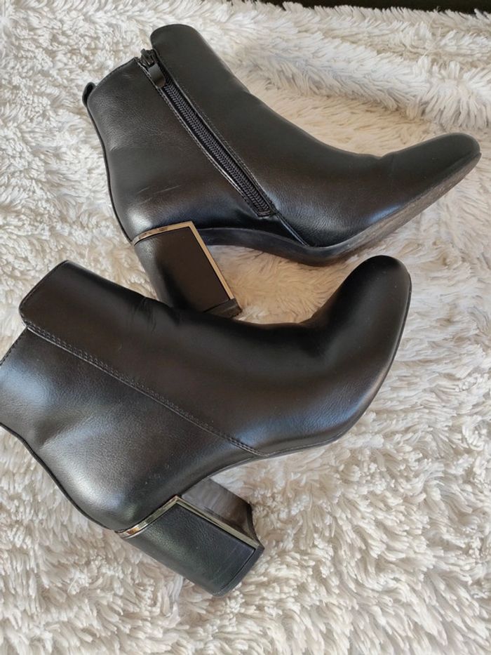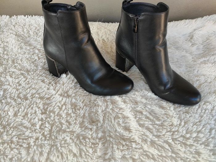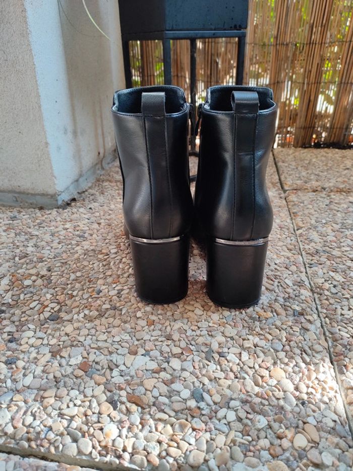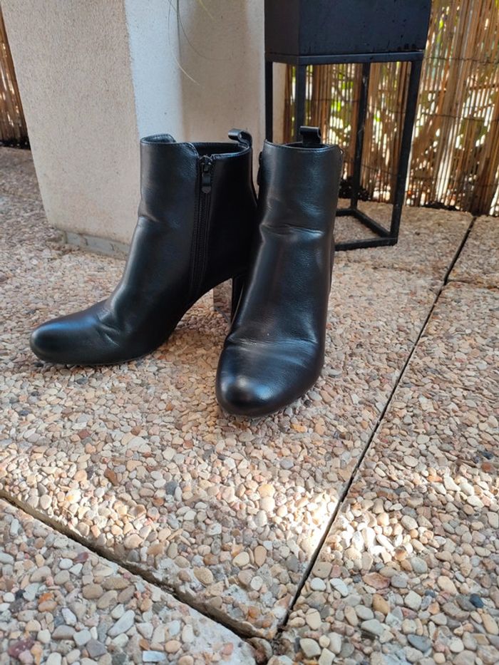Bottines noires avec liseré or sur les talons. Se ferme avec une fermeture éclair. Talon carré à bout rond. Hauteur : 7 cm Hauteur bottines : 18 cm Marque : Chaussea Taille : 38 Très bon état, juste pliures sur le devant.