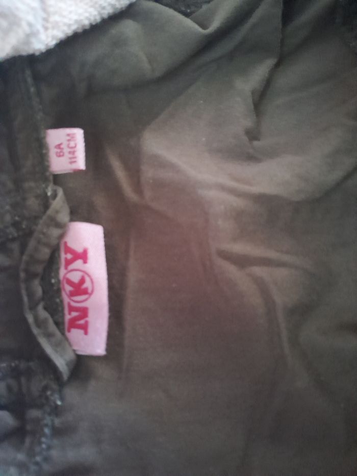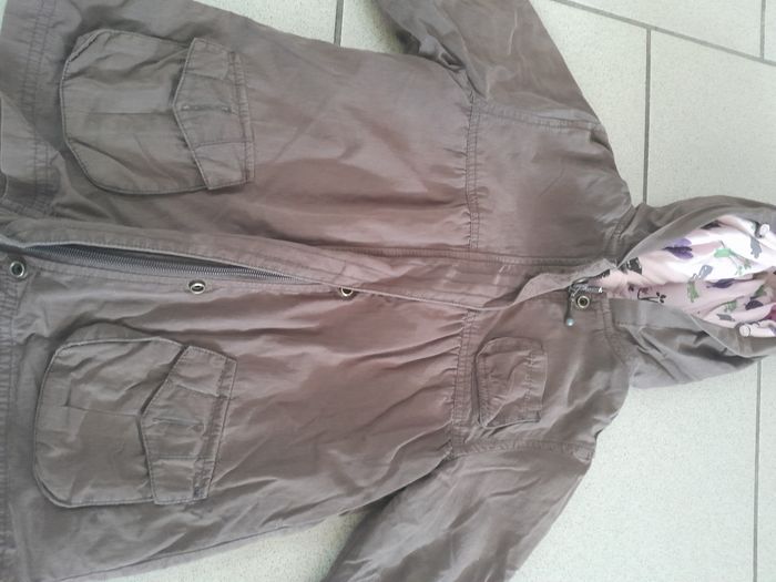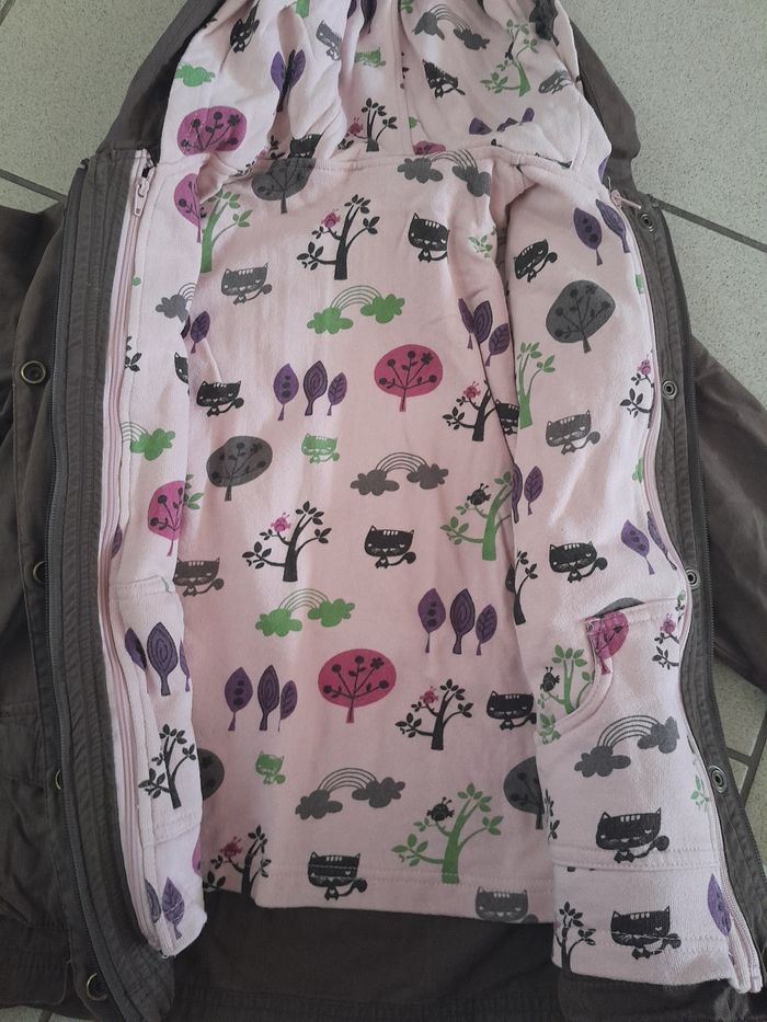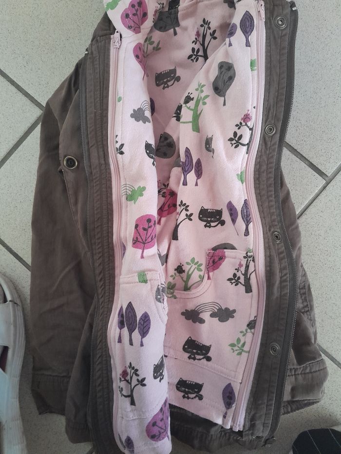 Veste en très bon état. Les fermetures fonctionnent très bien. Il y a 2poches. La veste(en rose)peut se détacher à l'aide de la fermeture et des boutons pour la capuche. Dans la veste rose, il y a aussi 2 poches.
