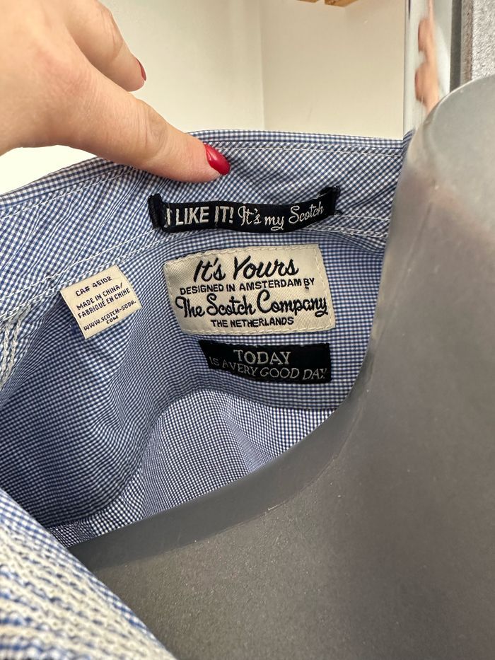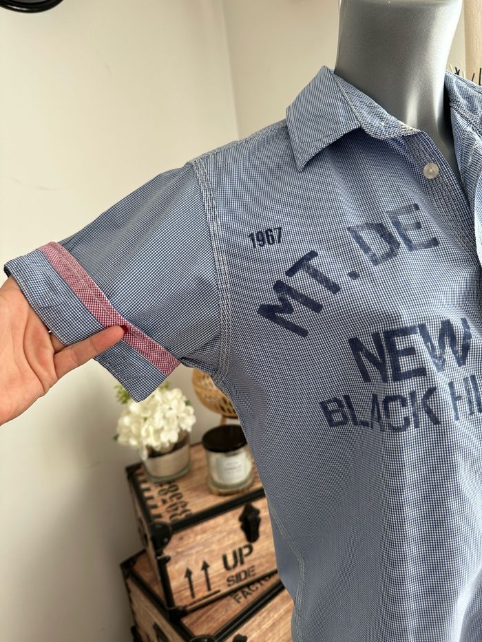 🌺🌺 Chemise homme à petit carreaux bleus , un peu de rose aux manches , courtes , motif sur le devant Taille M. Scotch & Soda. Seconde main en très bon état 🌺🌺