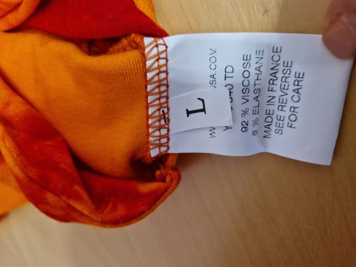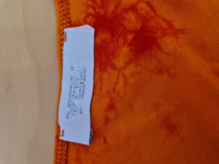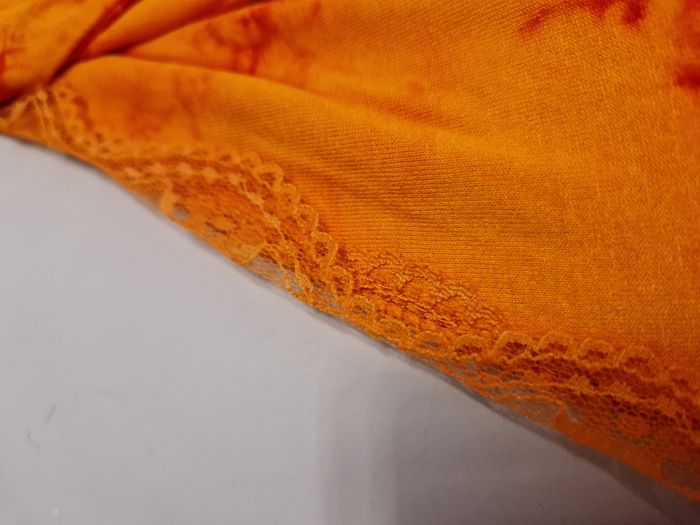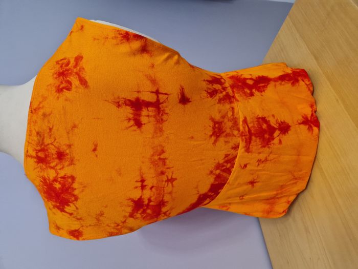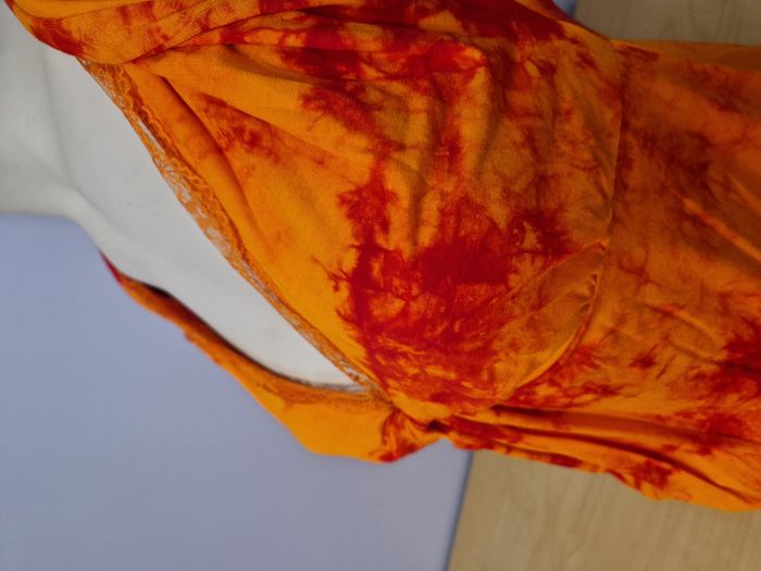 Top femme fluide orange et rouge sans manche Elastiqué à la taille pour un effet bouffant Dentelle bordant le décolleté Marque You / Taille L - Parfaitement neuf