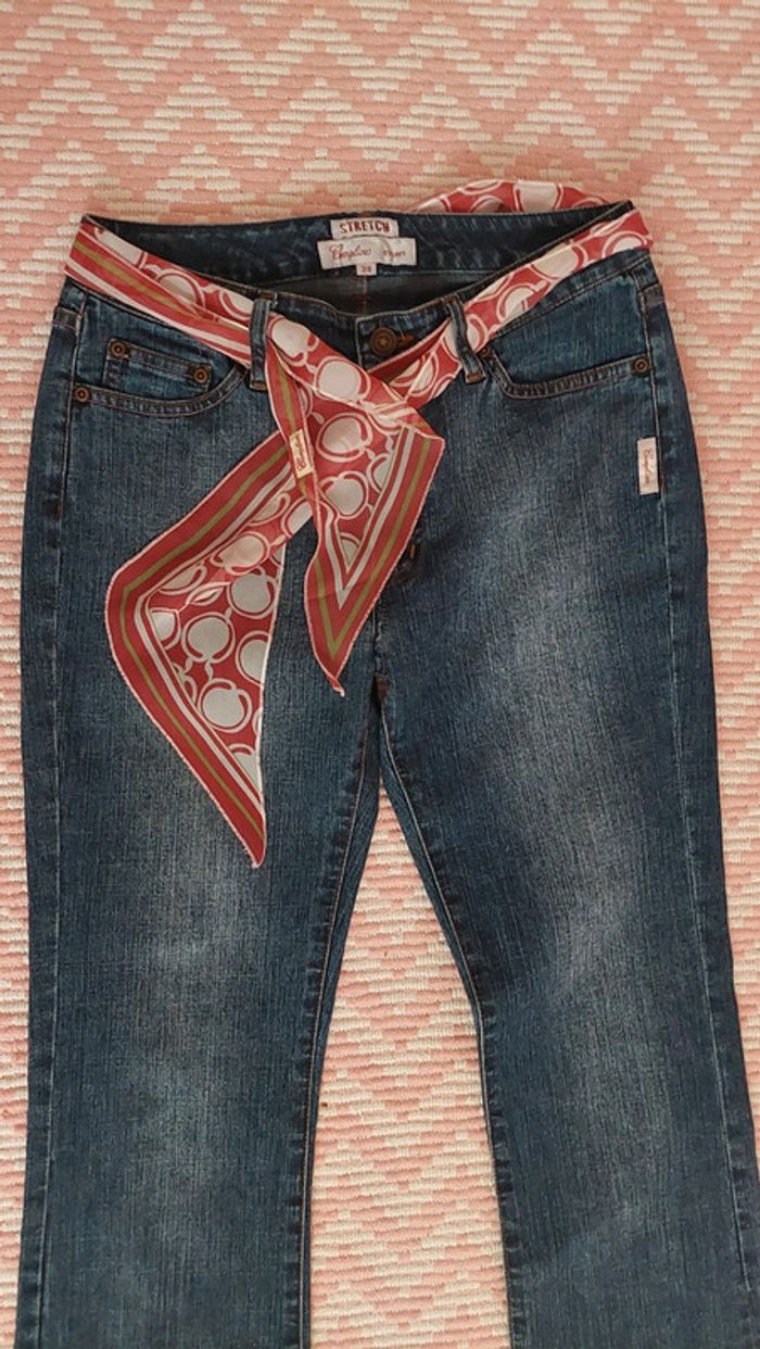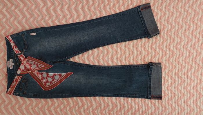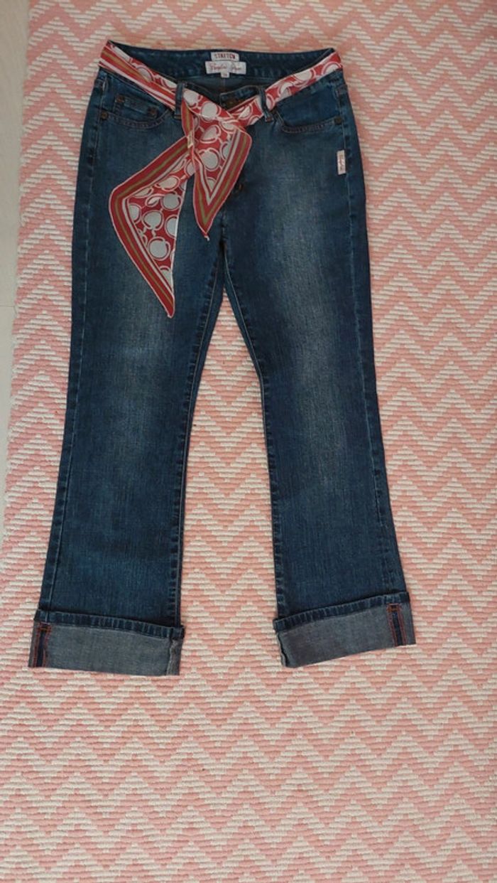 État neuf jamais porté pantalon jean vintage de marque Complices légèrement évasé en bas avec ceinture bandeau foulard à nouer. Taille 38. Longueur jambe 91 cm.