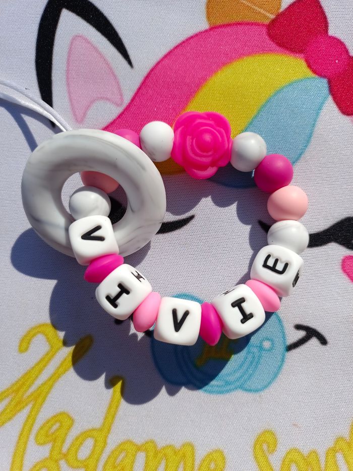 Un anneau de dentition Petite Rose pour soulager bébé durant ses poussées dentaires, sert à être mâchouillé en toute sécurité.  Respect des normes CE, composée de perles silicone alimentaire et/ou bois naturel. 100% personnalisable, énormément de choix de clips, perles, etc… Envoyez-moi un message afin de créer main dans la main votre accessoire idéal.