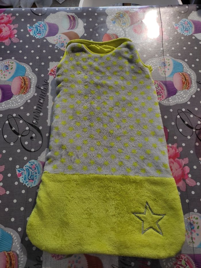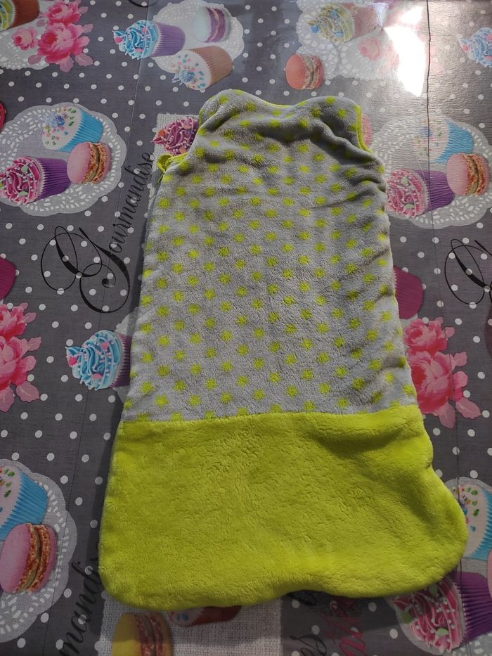 Gigoteuse 0/6 mois très chaude en très bon état juste quelques bouloche de frottement a l'intérieur . Deux pression en haut très pratique pas besoins de passer le bras .