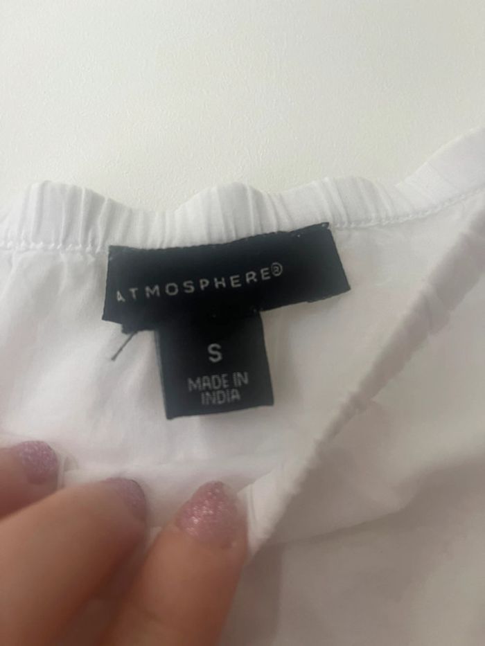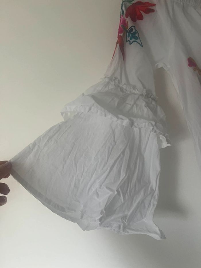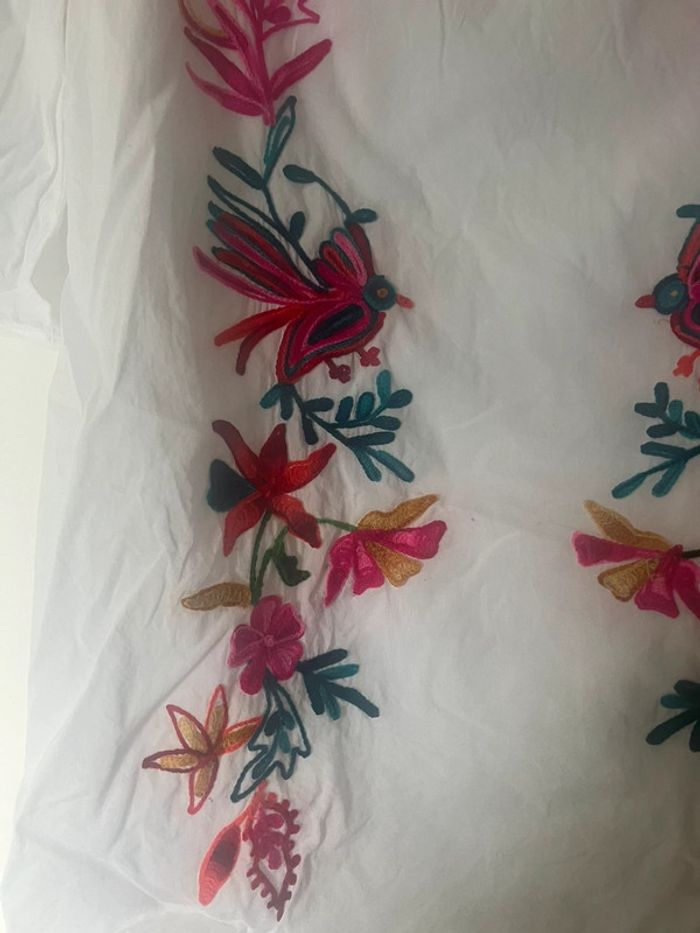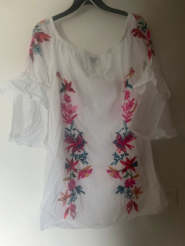 #femmeS Haut atmosphère taille S Blanc, léger , motif coloré, manches bouffantes Je ne l’ai pas porté
