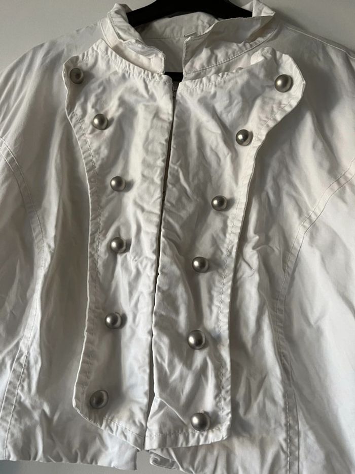 #femmexl Veste courte taille xl Froissé car non repassé après lavage 2 petits points visible sur la photo de l’étiquette détaille