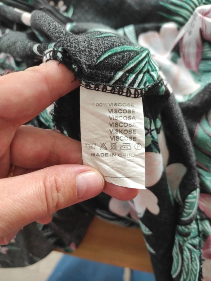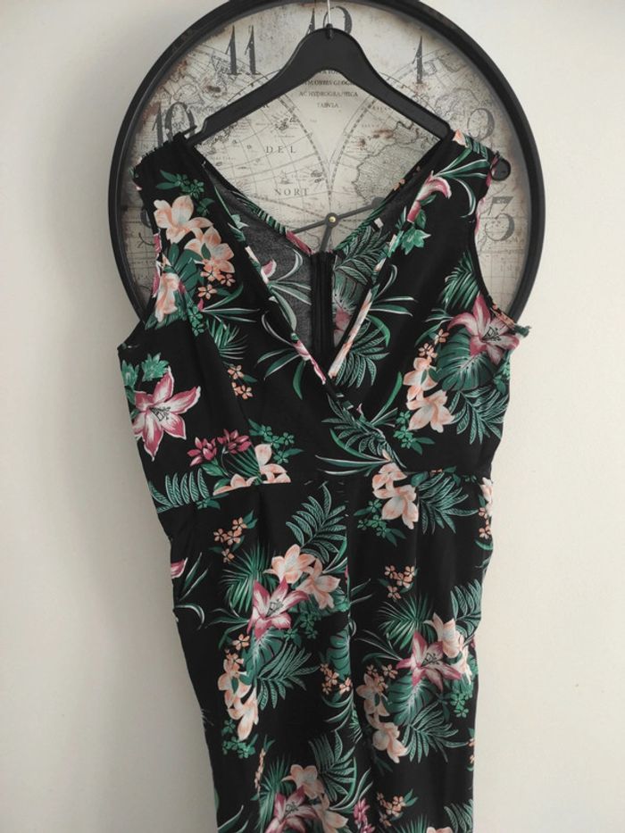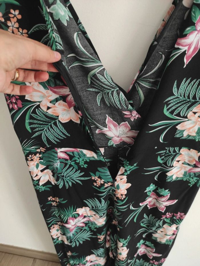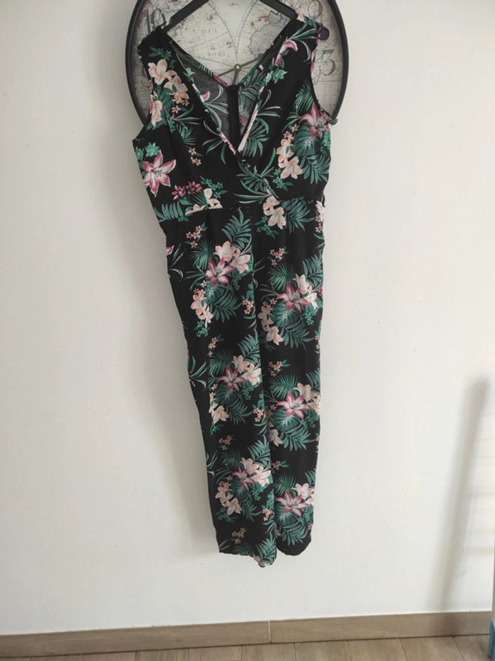 Jolie combinaison pantalon sans manches, noire avec des motifs fleurs verts et rose. Idéale pour cérémonie type mariage, baptême,. Pas d'étiquette de taille correspond à 42