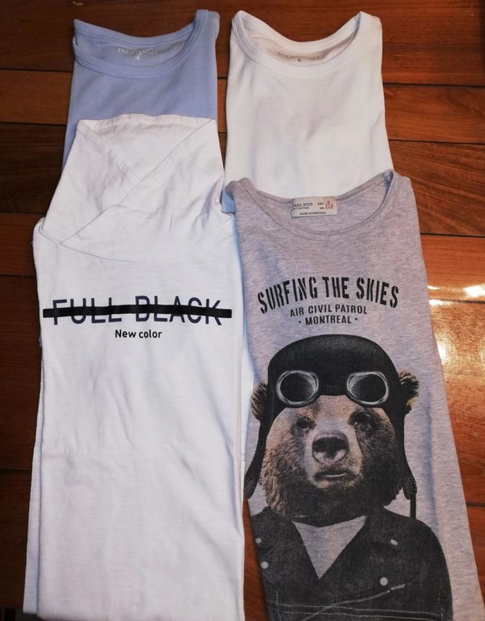 Vends lot de 4 tee shirt ML. Taille 6 ans mais pour moi c'est du 5 ans car ils taillent petits. Bon état. Les deux (bleu et blanc) sont de la marque In extenso, le blanc avec le col est de chez Kiabi et le dernier je ne sais plus.
