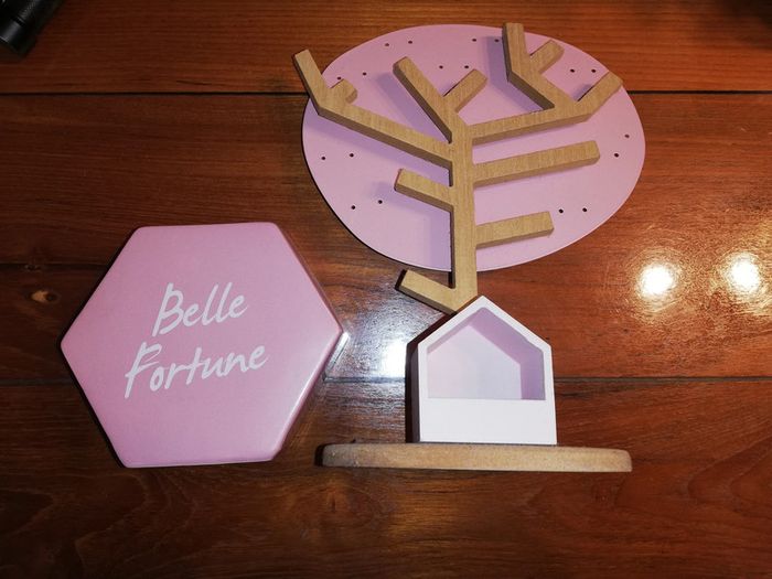Vends arbre à bijoux + tirelire dans les couleurs vieux roses. Très bon état.