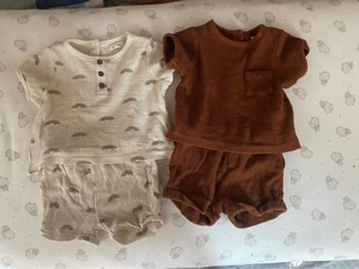 Lot de 14 vêtement en taille 6mois tous venant de vert baudet 3 bodys 2 short 2 tenue (t-shirt/short) 3 salopette courte 1 salopette longue 1 combinaison Une tâche qui ne part pas sur la salopette longue( voir photo)