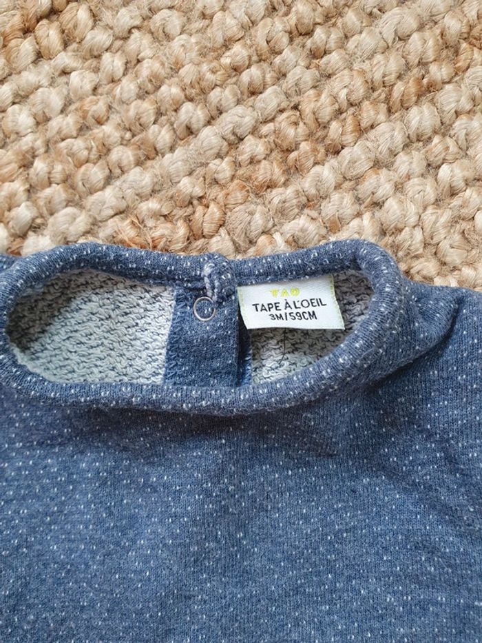 Sweat avec ouverture/fermeture ds le dos. Taille 3 mois. Marques d'usages.